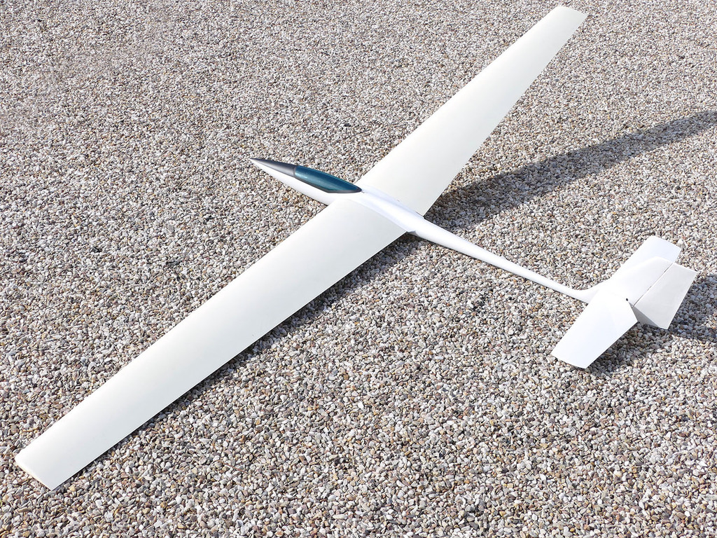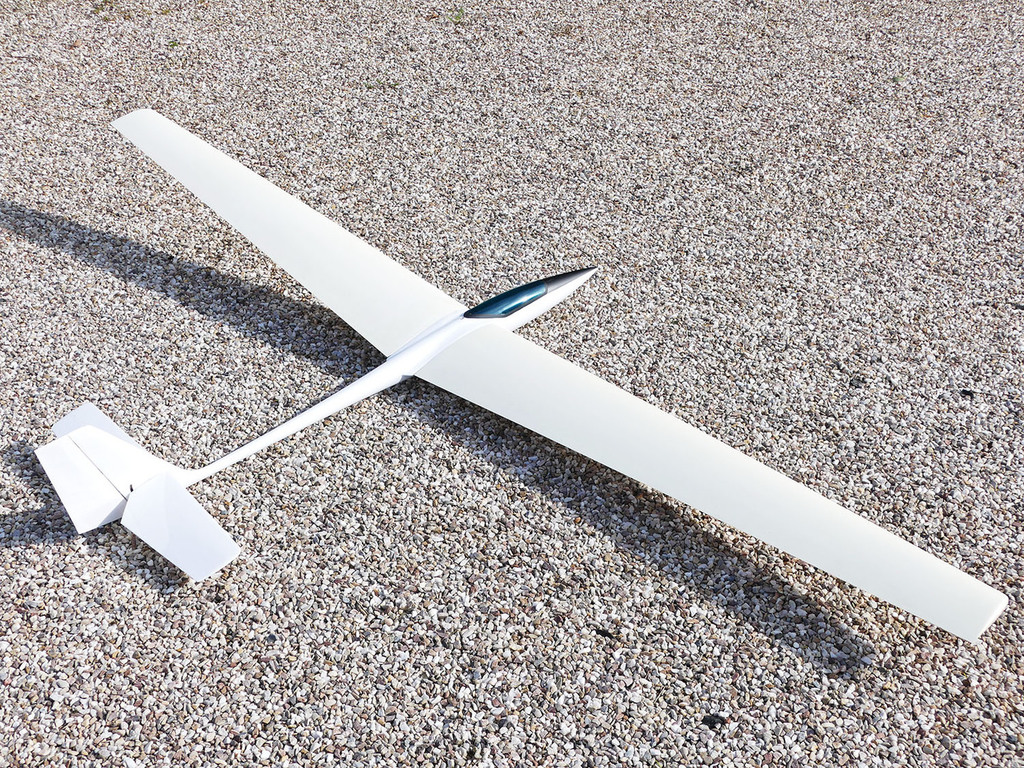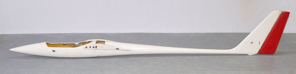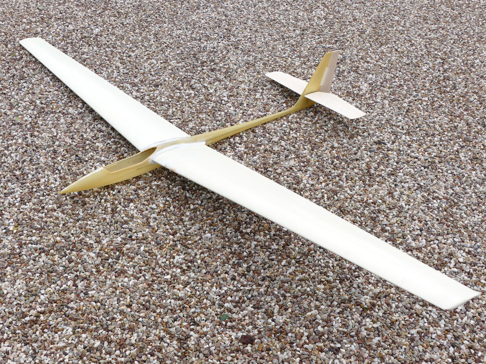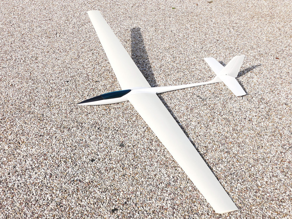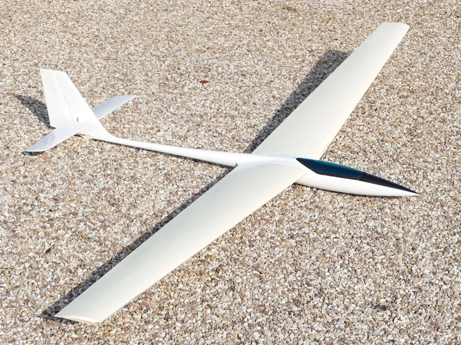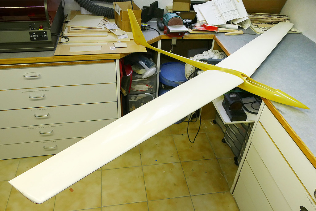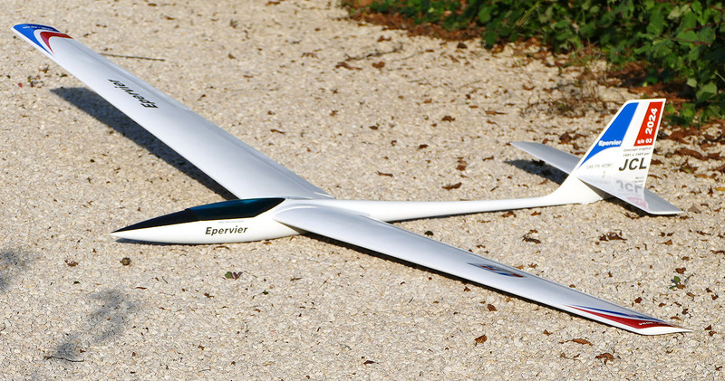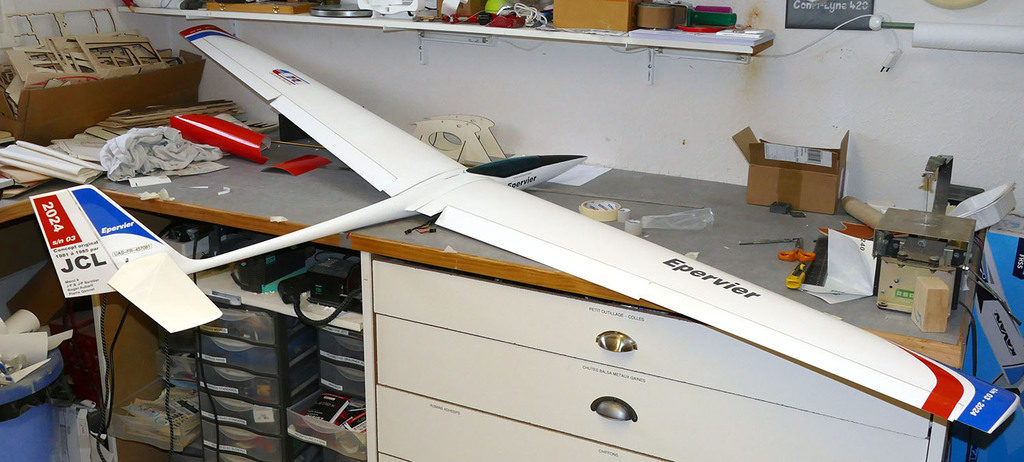 Depuis longtemps, l'envie de retrouver ce planeur "magique" me travaillait, et entre 2019 et 2024, les planètes se sont alignées pour retrouver les éléments permettant de refaire un Epervier : des ailes de Gerfaut BLS pratiquement neuves, un fuselage à remettre en état de Flamingo (1ère version) de Multiplex, puis un fuselage et une verrière complètement neufs… A l'automne 2024, je pus me mettre au travail sur ce projet de planeur "vintage". Pourtant, avec ce fuseau si profilé et ses ailes en fibre, et sa configuration "quadro-flaps", on a peine à imaginer qu'il s'agit d'un "plus de 40 ans" ! Seuls le museau pointu et la dérive en flèche accusent son âge, puisque les nez sont plus ronds depuis longtemps et les dérives sont plus verticales de nos jours.