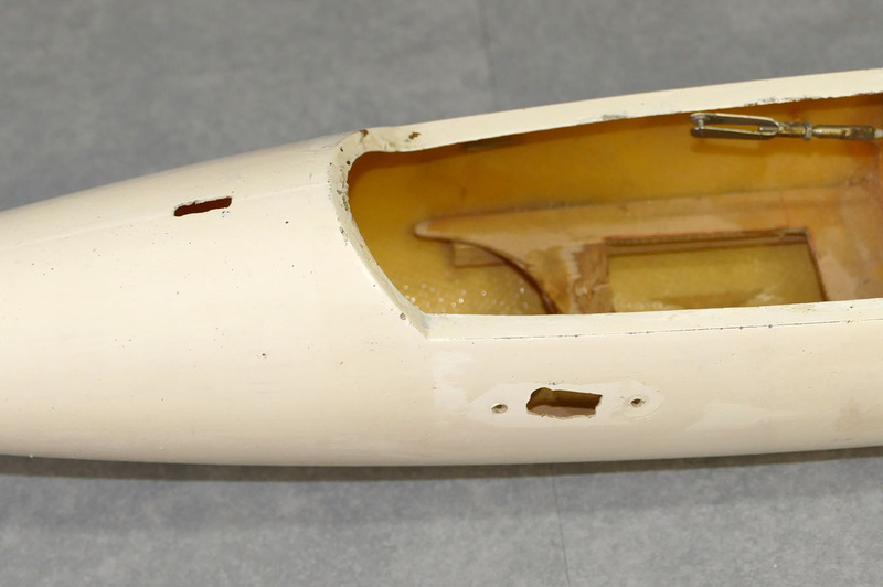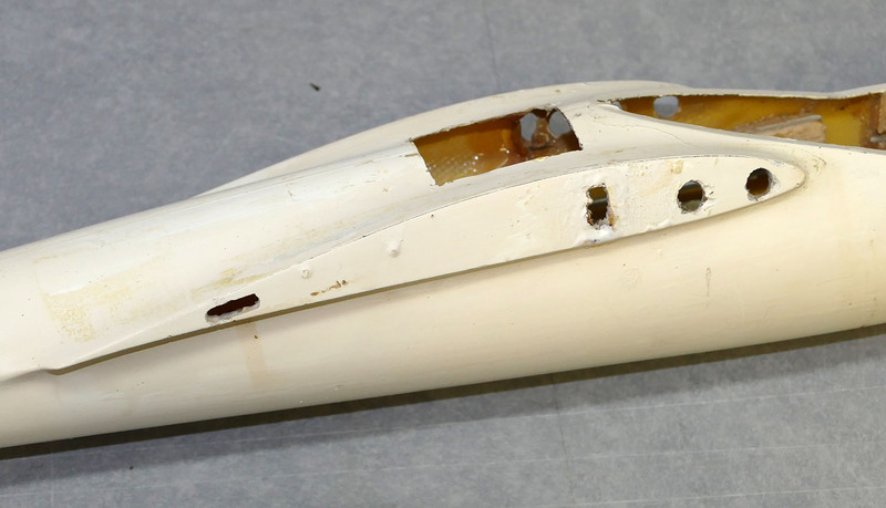 Ainsi, un fuselage de Flamingo, version initiale à museau bien pointu, arriva dans mon atelier. Oui, il avait besoin de pas mal de travail pour devenir un Epervier, mais c'était faisable. Il allait falloir réussir à vider les platines dans le fuselage pour en faire de nouvelles adaptées aux équipements modernes, reboucher de très nombreuses ouvertures qui avaient été pratiquées sur le dessus, le flanc et même le dessous avec une fente de crochet de remorquage particulièrement large. L'état des perçages des emplantures n'était pas un problème, puisque de toute façon, pour adapter les ailes à profil FX 60-126 de 230 mm de corde, il était impératif de coller de fausses nervures. Et donc, les nouveaux "trous" seraient faits sur ces fausses nervures. Mais bon, il faudrait faire de la fibre quand même et bien remastiquer la bête. A l'arrière, il faudrait ouvrir la dérive pour réinstaller un palonnier de profondeur, celui-ci ayant disparu.