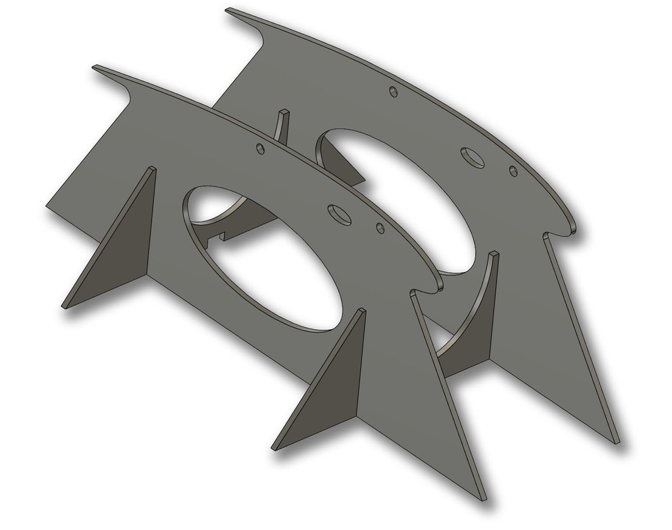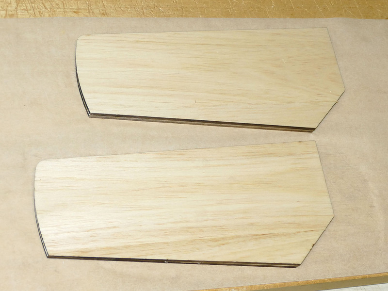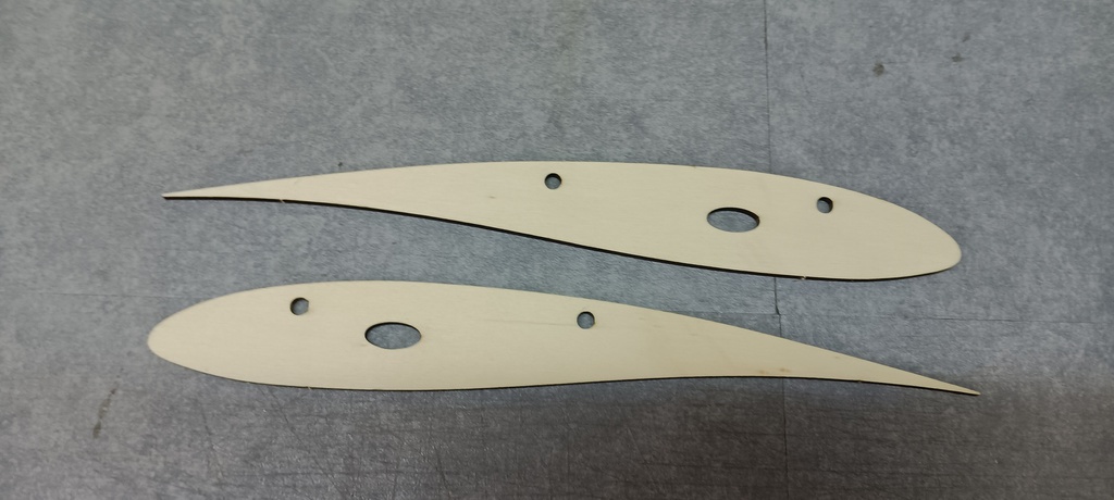 Comme les ailes ne peuvent être modifiées, ce sont elles qui feront foi et j'ai retracé informatiquement le profil BLS dans Fusion 360 et j'ai pu ainsi couper deux nervures en contreplaqué de 3 mm à coller contre les emplantures du fuselage. Les trous pour les clés d'ailes, celui pour le crochet de l'élastique y sont prévus.