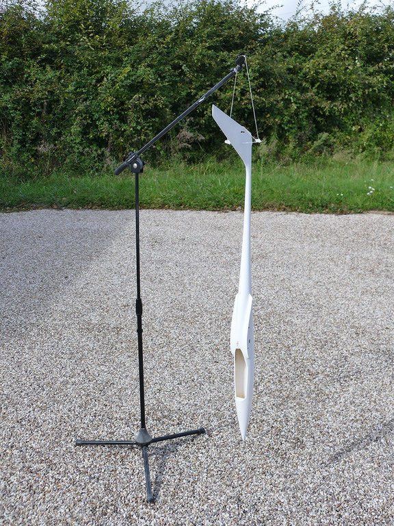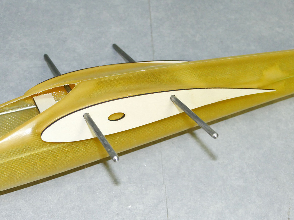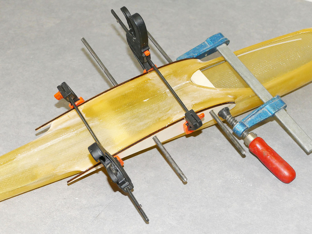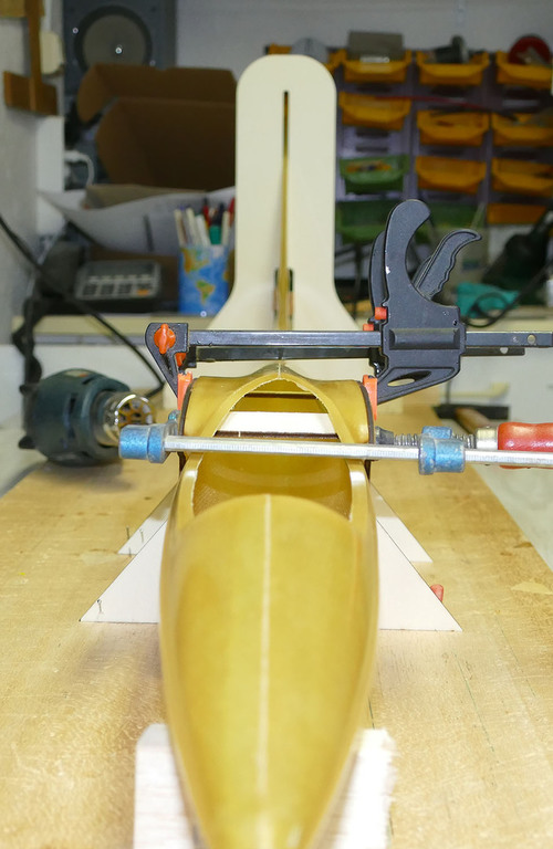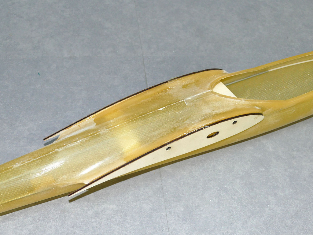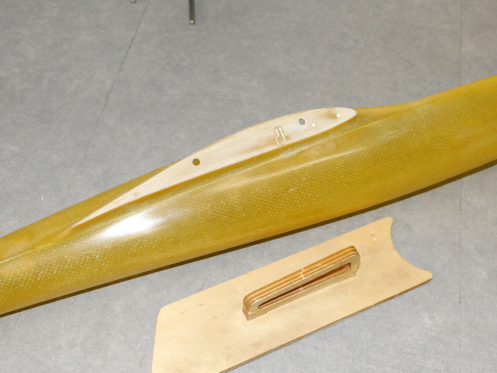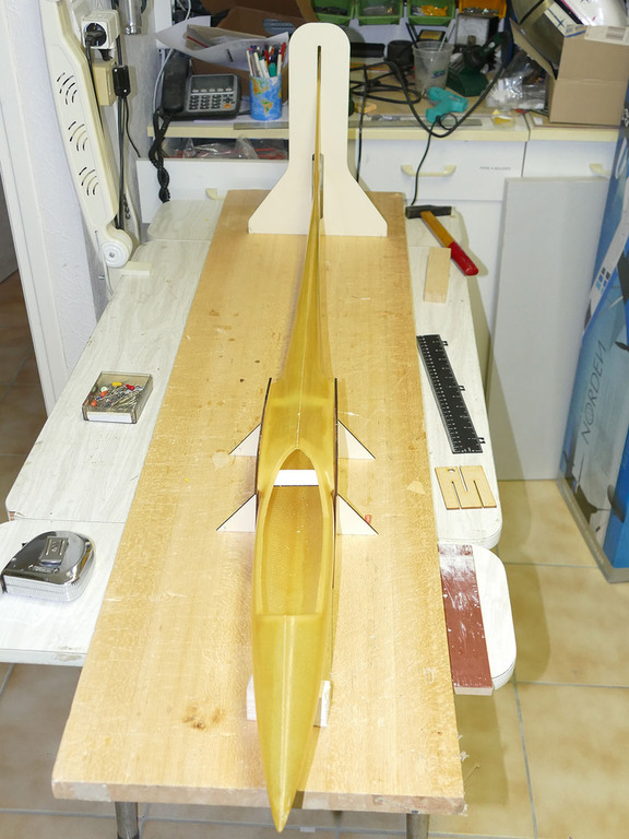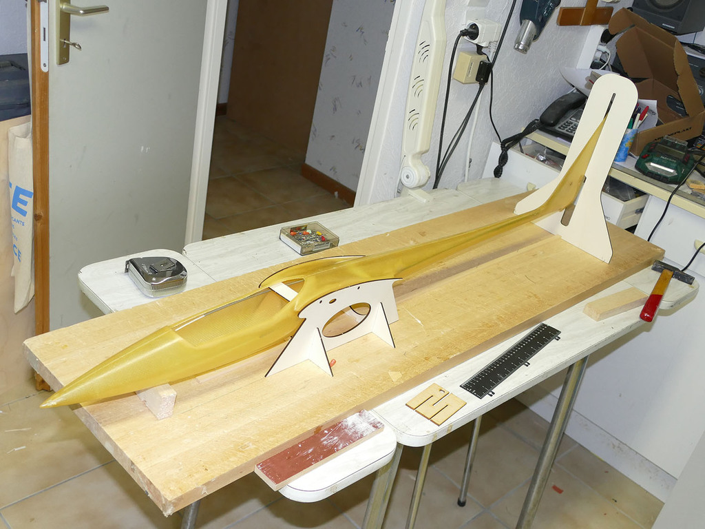 Il reste à bien positionner ces nervures, symétriques d'une part, mais aussi avec le bon calage. J'ai réalisé un bâti pour tenir le fuselage bien droit. Avec des cales, je peux positionner le fuseau bien horizontal et avoir le profil d'aile calé à 1,5°, quand le stab sera à 0°. Un autre gabarit maintient la dérive parfaitement verticale. C'est alors que je découvre que le fuselage neuf est vrillé : la dérive verticale, les deux emplantures ne sont pas de niveau… A-t-il été démoulé trop vite 40 ans plus tôt, ou est-ce le temps passé stocké qui a introduit ce vrillage ? Impossible à savoir, mais pour rectifier, j'ai prudemment chauffé toute la poutre arrière avec un décapeur thermique et j'ai contraint le fuselage pour le ramener pratiquement droit et j'ai laissé refroidir… En deux ou trois fois, j'ai obtenu un résultat à peu près convenable. Je pouvais alors percer les emplantures grâce à mon gabarit, puis coller les deux nervures. Il restait à combler les espaces entre le fuselage et ces nervures pour refaire des karmans adaptés aux nouvelles emplantures. J'ai commencé à l'époxy fortement chargée de microbilles de verre, et pour la finition, mastic polyester (syntofer). C'est un peu long, car après chaque ponçage, on trouve des zones à retoucher, donc à recharger de mastic, puis à reponcer, de plus en plus finement jusqu'à ce que le résultat me convienne (certains feraient bien mieux que moi, mais la limite est directement liée à ma patience, qui est assez limitée je l'avoue.).