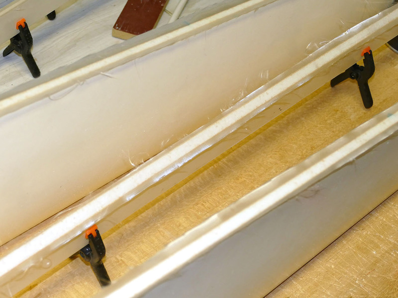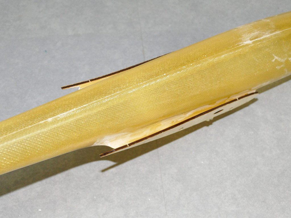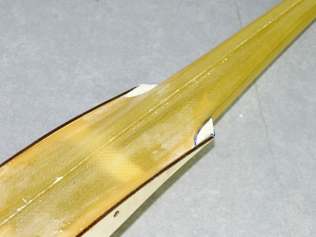 Il reste à refermer les chants en polystyrène sur l'aile et sur les ailerons et volets, ce que je fais comme à l'époque avec du tissu de verre et de la résine époxy. Ouf, le plus dur est fait !