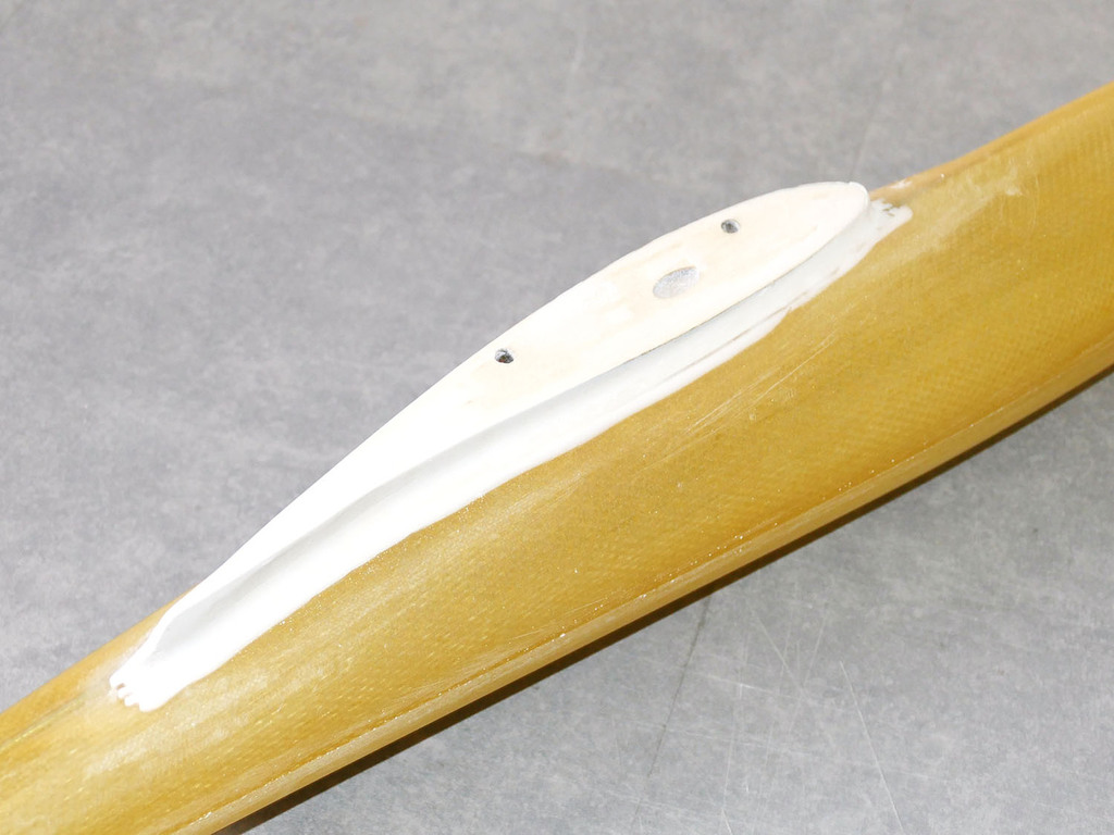 Le système pendulaire pour le stab est installé dans la dérive avec la commande e profondeur dans sa gaine, il est l'heure de refermer la dérive. Je façonne une baguette de balsa et hop, collage à l'époxy.