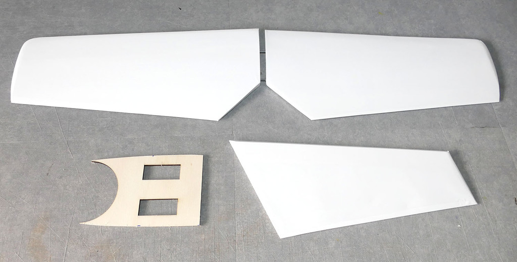 Voilà donc posée sur le plan de travail la base de l'Epervier 03… Si j'ai une planchette de contreplaqué issue du kit de Flamingo pour les platines radio, ainsi que la gouverne de direction d'origine, les deux nervures que l'on voit en bas sont le profil exact des ailes de Gerfaut, calquées, scannées, modélisées et découpées avec mon petit laser. Ce sera la base pour modifier les raccords ailes-fuselage... Le premier travail à faire pour transformer un Flamingo en Epervier.