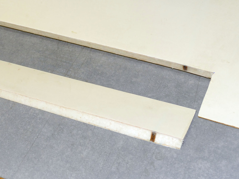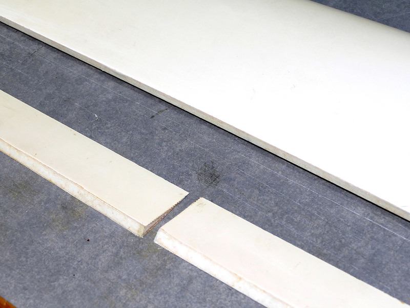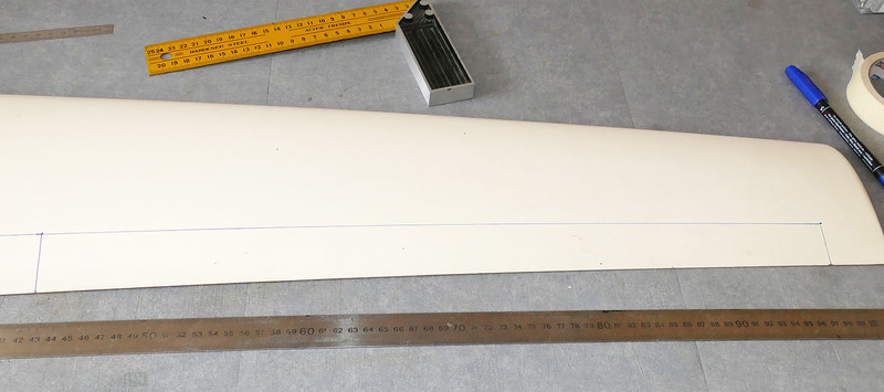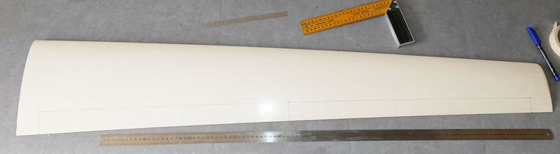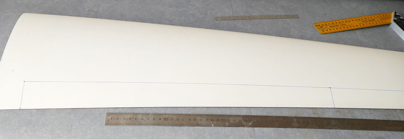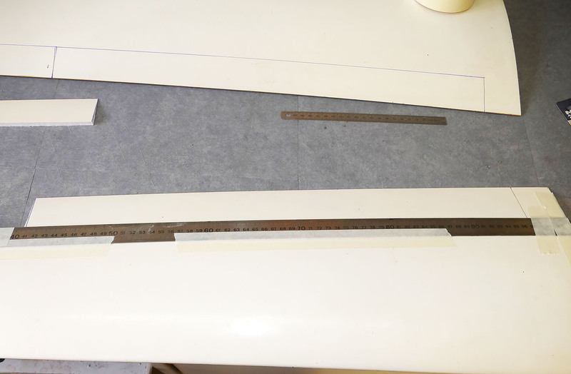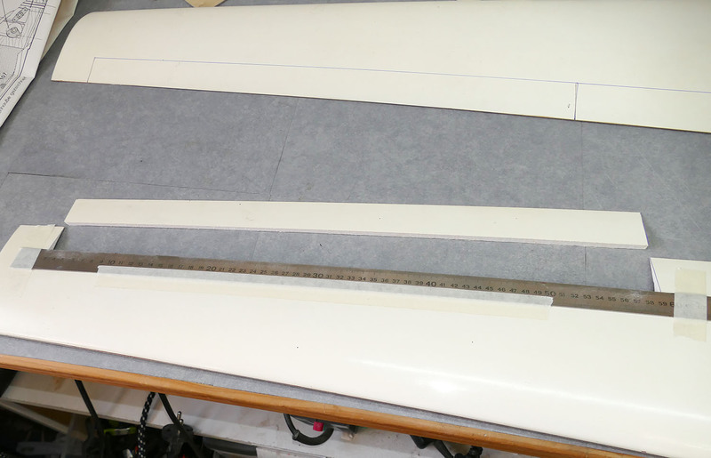 Un réglet métallique de plus d'un mètre est scotché sur l'aile pour guider la lame et hop… En quelques minutes, l'affaire est entendue. Le plus délicat est de recouper les biseaux à l'avant des gouvernes. Je colle des cales sur la scie et ça se passe bien.
