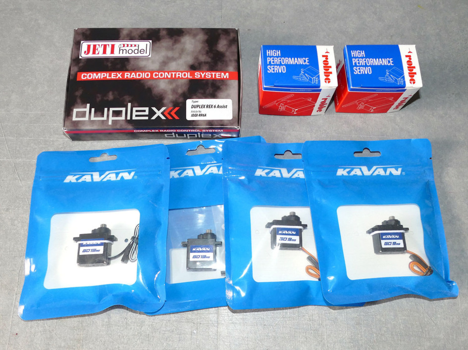 Pour les volets, j'ai choisi les Kavan GO13MG (13 grammes analogiques). Les ailerons seront actionnés par des Kavan GO09MG, qui sont des 9 grammes digitaux. Au passage, les servos de profondeur et de direction qui iront à l'avant du fuselage seront des Robbe FS300, format un peu plus petit que des standards, mais digitaux et avec un couple "qui va bien". Le récepteur prévu est un Jeti Duplex Rex6 Assist (avec gyros et alti-vario intégrés).