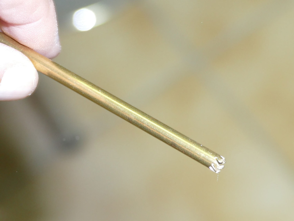 fabriquer un trépan en affûtant un tube laiton de 5 mm, que l’on monte dans le mandrin de la perceuse et ensuite… Il faut viser juste en deux dimensions… Finalement, ça s'est bien