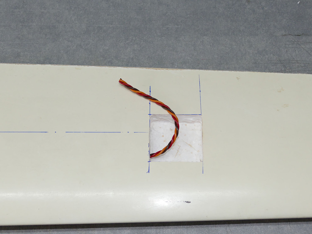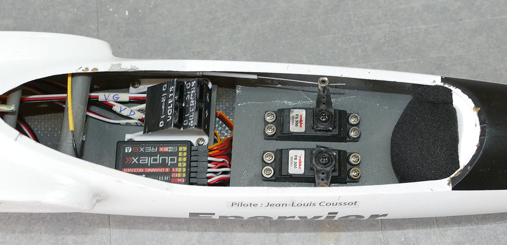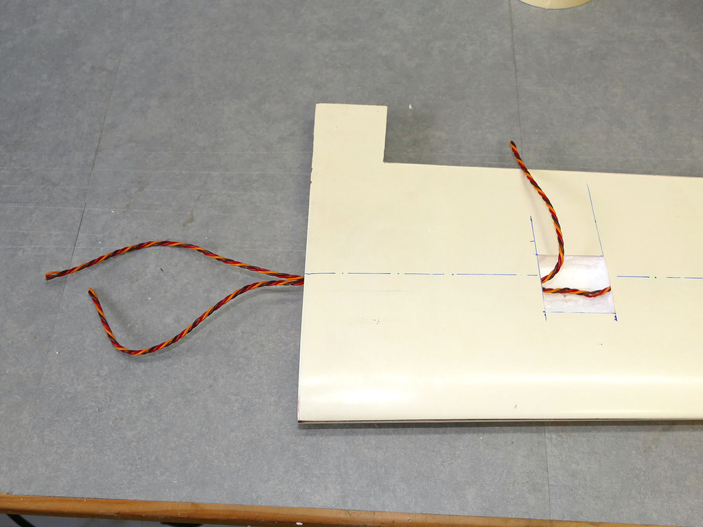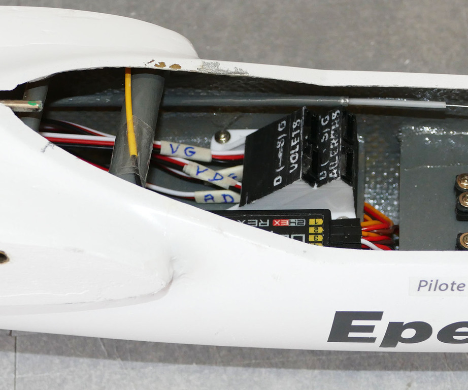 Les fils des servos ont été rallongés, les fils passés dans les ailes avant de faire les soudures, en les tirant à l'aide d'une gaine de commande en plastique de 2 mm.