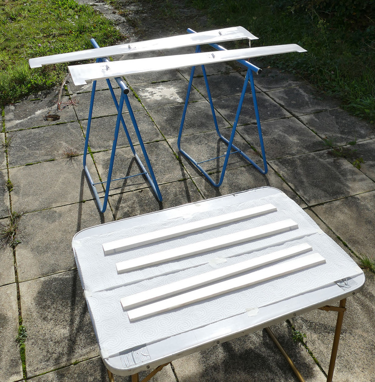 Ensuite, deux couches de primaire blanc en bombe, et une couche finale de blanc satiné. Ouf, voilà les ailes d'un beau blanc, comme le fuselage.