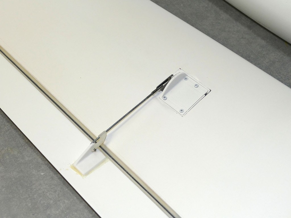 Ainsi, je pourrais avoir mes phases de vol habituelles variant la courbure de l'aile, mais aussi des "crocos" pour faciliter l'atterrissage. Le débattement des volets vers le bas ne sera pas aussi fort que sur les modèles actuels, ça obligerait à faire une fente bien trop large à l'intrados, mais ce sera plus agréable que les flapperons relevés de l'époque, qui restaient un tantinet brutaux…