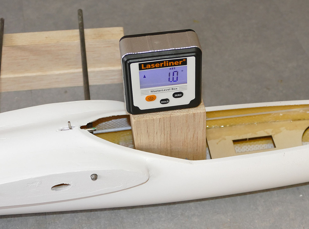 Pour le récepteur, je vais monter un Jeti Rex 6 Assist, qui dispose de Gyros 3 axes, d'accéléromètres 3 axes et d'un capteur altimètre-variomètre. Je pourrais ainsi avoir un mode "gyros coupés", un mode de stabilisation standard pour atténuer les turbulences, et un mode limitant les inclinaisons en roulis (15°) et tangage (5° à cabrer, 15° à piquer) qui me sert uniquement quand je lance seul le planeur en conditions turbulentes. Cela permet au planeur de s'auto stabiliser durant les deux secondes nécessaires à ce que les mains reviennent sur les manches. Pour cela, il faut que le récepteur soit positionné avec précision et donc, je lui ai installé une platine séparée, positionnée à l'aide d'un niveau électronique, sur les deux axes.