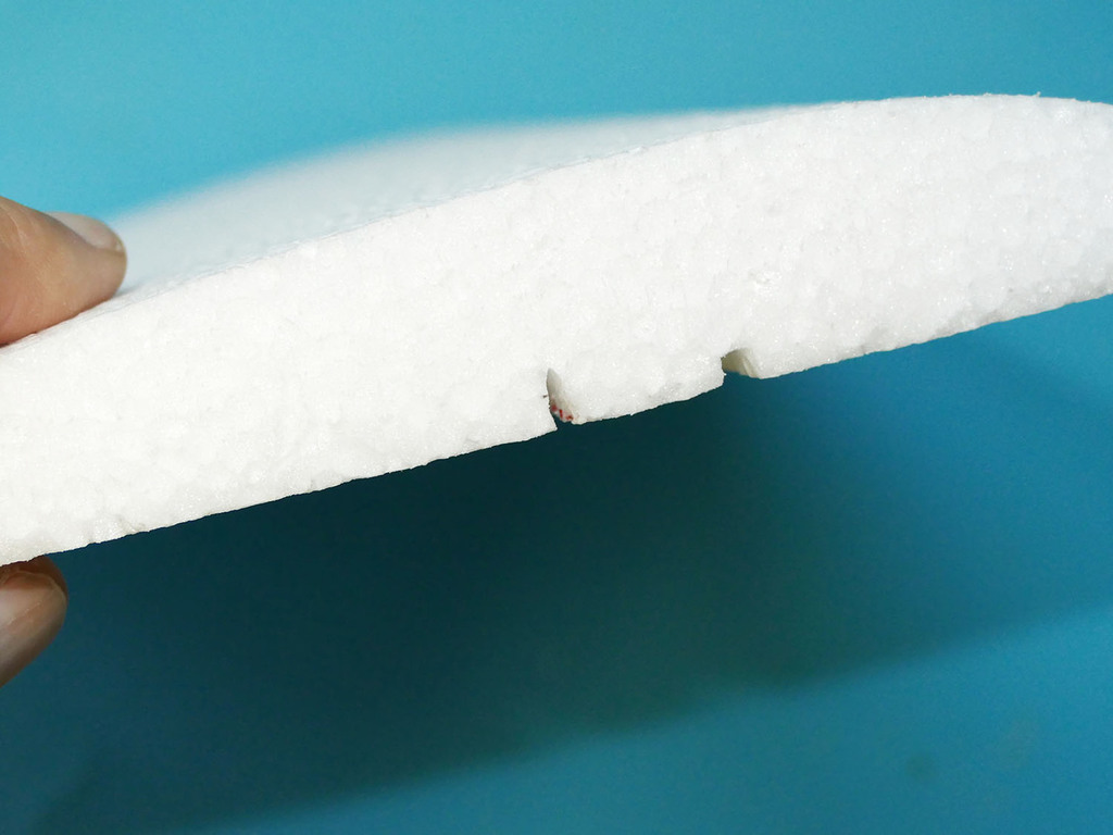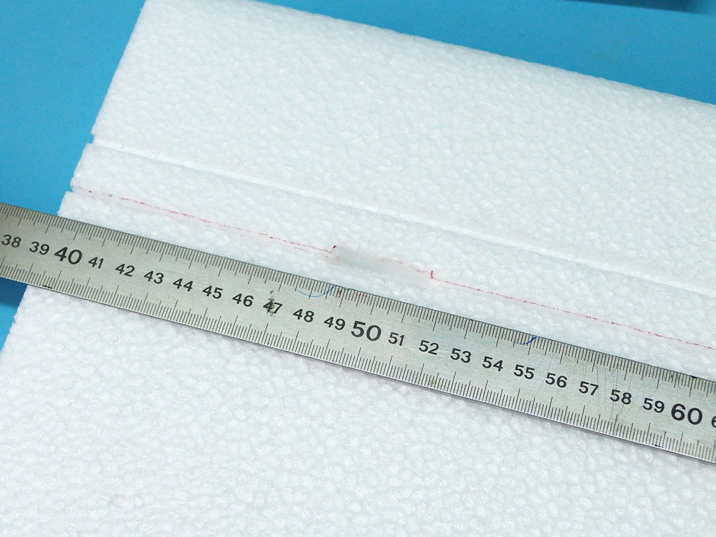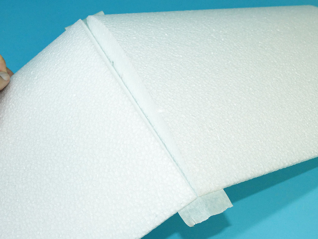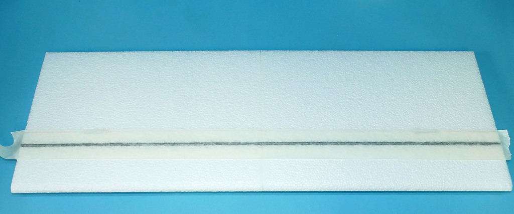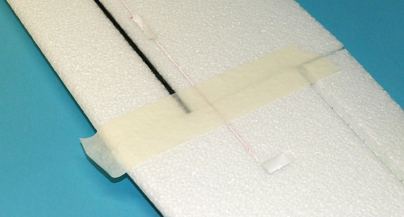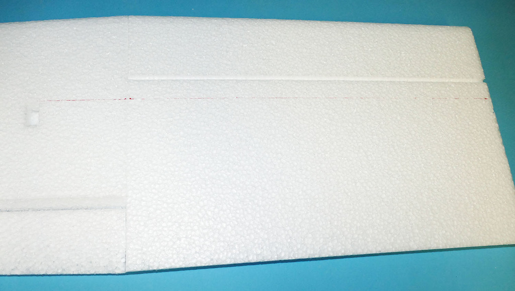 J'ai commencé par prévoir le passage des fils de servos à l'intrados. Je pense que sur les kits de série, une fente sera réalisée d'origine lors de la découpe des panneaux au fil chaud, au moins pour les panneaux centraux. J'ai réalisé cette fente avec un cutter chauffant, bien pratique.