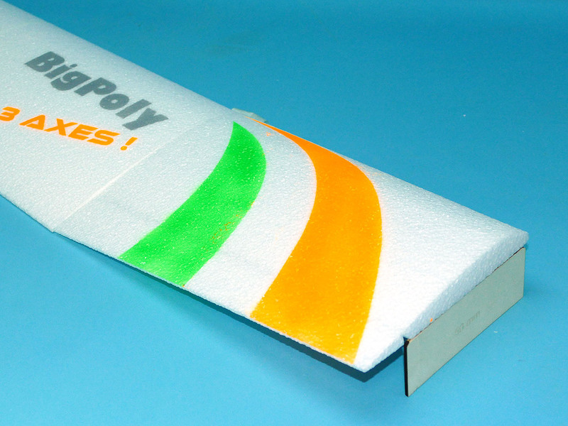 Voilà, l'aile 3 axes remplace sans modification sur le fuselage (autre que le câblage sur le récepteur) l'aile 2 axes du BigPoly 1400. Le look change nettement avec les extrémités trapézoïdales et