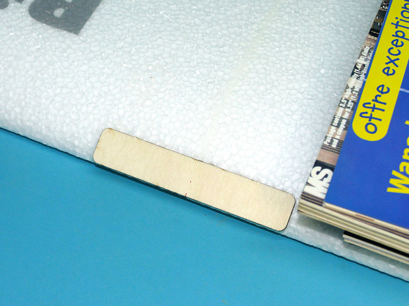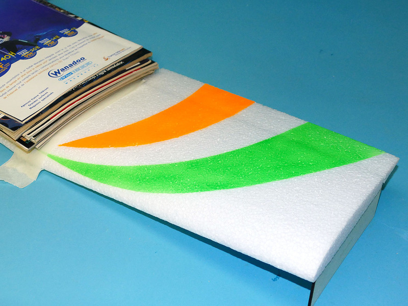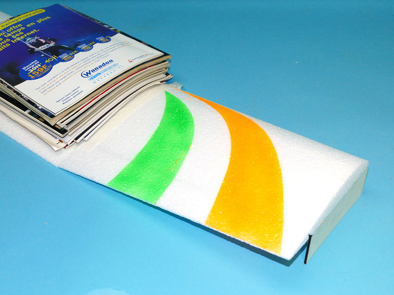 Ensuite, il n'y a plus qu'à assembler les panneaux d'ailes de la même façon que pour le deux axes. Simplement, cette fois, j'ai réalisé le décor avant de contrecoller les panneaux d'ailes, car c'est plus facile tant que c'est tout à plat… Le décor est réalisé avec les mêmes peintures en bombe RC Styro Colors que pour le 2 axes, afin que l'aile 3 axes ne jure pas avec le décor du fuselage.