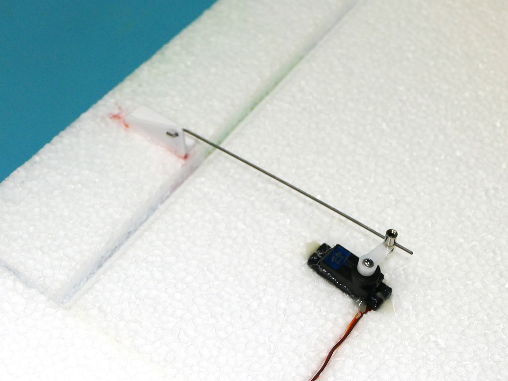 Les commandes sont en corde à piano de 1,2 mm avec pli en Z côté guignol et un connecteur à vis (domino) sur le palonnier de servo.