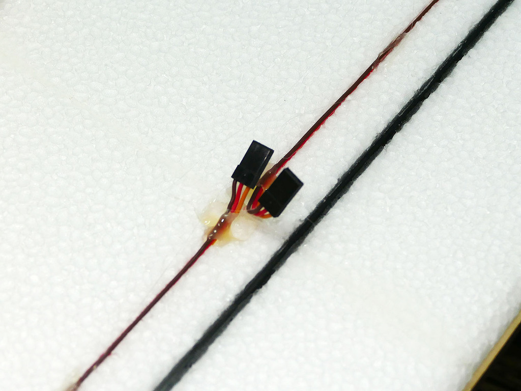 J'ai préparé des rallonges de fils de servos de 20 cm et creusé les emplacements pour les connecteurs de ces rallonges afin que tout s'encastre sans dépasser à l'intrados. Les logements de servos ont été ajustés au format des servos utilisés.