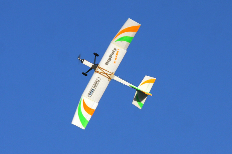 Décollage : L'accélération est rapide plein gaz et on décolle sans vent en 5 à 10 mètres tout au plus. La tenue d'axe est bien maîtrisée par une direction efficace car bien soufflée. Pour l'élève, la difficulté est de réagir sur le manche de direction et pas aux ailerons… Avec un peu de vent de travers, le BigPoly 3 axes est bien plus facile que le 2 axes. Ce dernier avec ses dièdres énormes prenait le vent sous l'aile et basculait sur l'autre aile, se retrouvant à tourner vers le vent arrière. Avec l'aile 3 axes et son dièdre beaucoup plus faible, on a beaucoup plus de facilité à tenir un petit vent de travers. Il faut garder les ailerons braqués du côté d'où vient le vent et toujours tenir l'axe à la direction, avec le bon compromis entre contrer le souffle hélicoïdal et contrer l'effet de girouette… Bon exercice ! Si le vent est trop fort en travers… il n'y aura pas de miracle, il faudra décoller en travers de la piste ou lancer à la main.