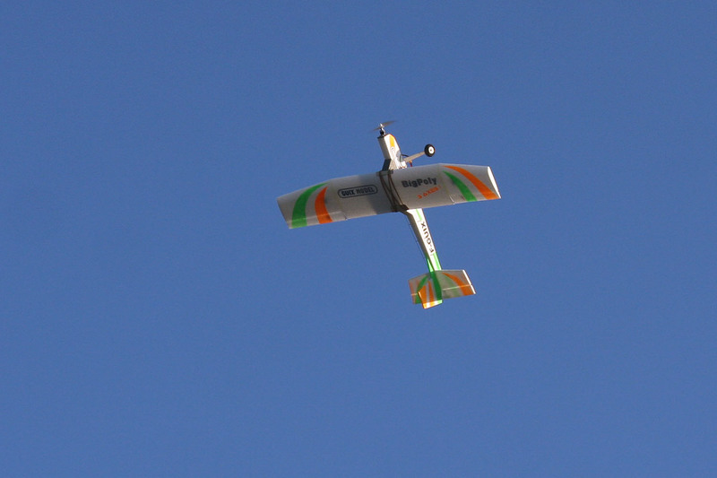 Vol très lent : On peut voler avec un filet de gaz à très basse vitesse sans crainte, le BigPoly est super-sécurisant. Il faut juste davantage utiliser la direction en virage et penser à remettre de la puissance s'il commence à s'enfoncer. Comme déjà dit plus haut, impossible de décrocher moteur coupé en petits débattements, et avec les grands, on est juste un peu moins stable, le nez oscille un peu, mais toujours pas de vrai décrochage à la clef. Et comme on l'a vu dès le premier vol, pas de vraie vrille quoiqu'on fasse, ce sera spirale engagée facile à sortir dans tous les cas.