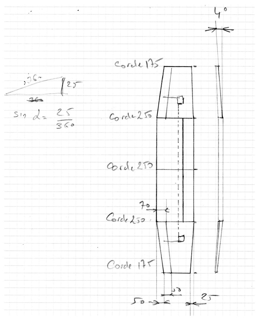 Le dièdre de 4° pour les panneaux externes a été doublé, passant à 8°, soit 50 mm sous les saumons quand j'avais 25 mm sur mon schéma.