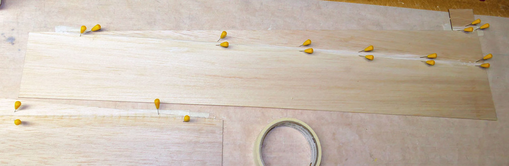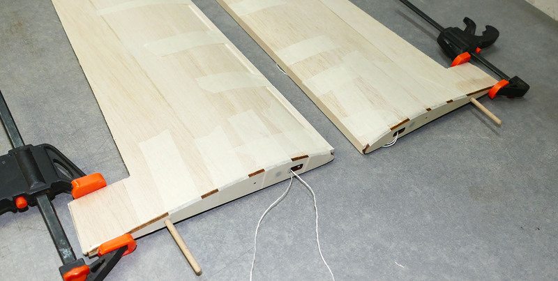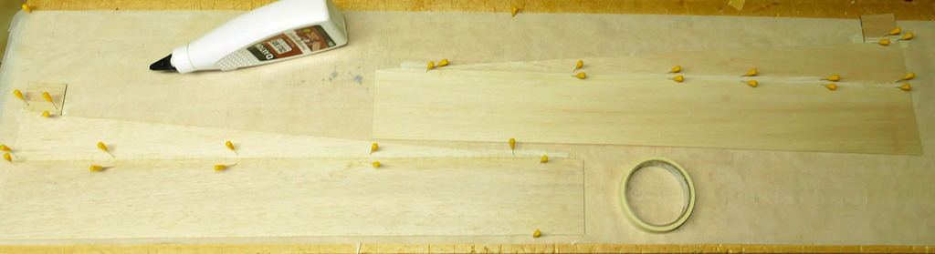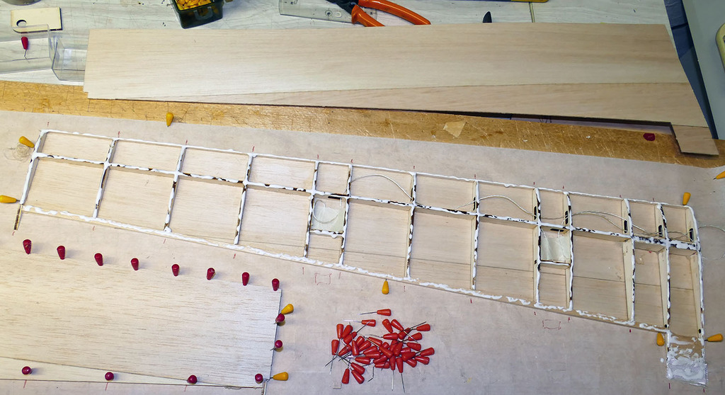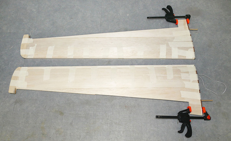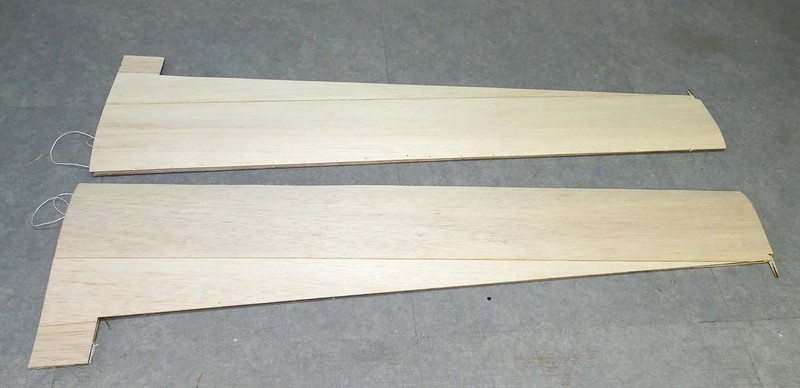 Les empennages assemblés vont rester une douzaine d'heures épinglés sur le plan de travail.