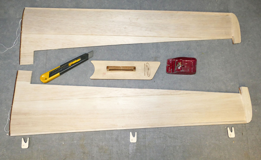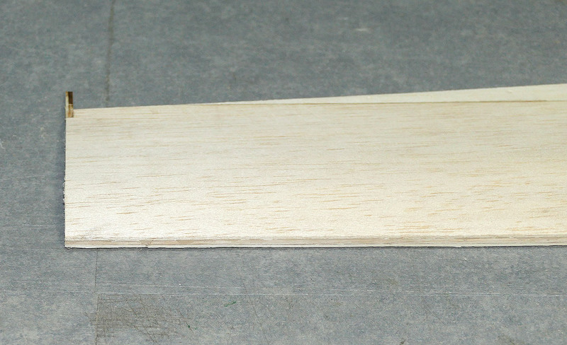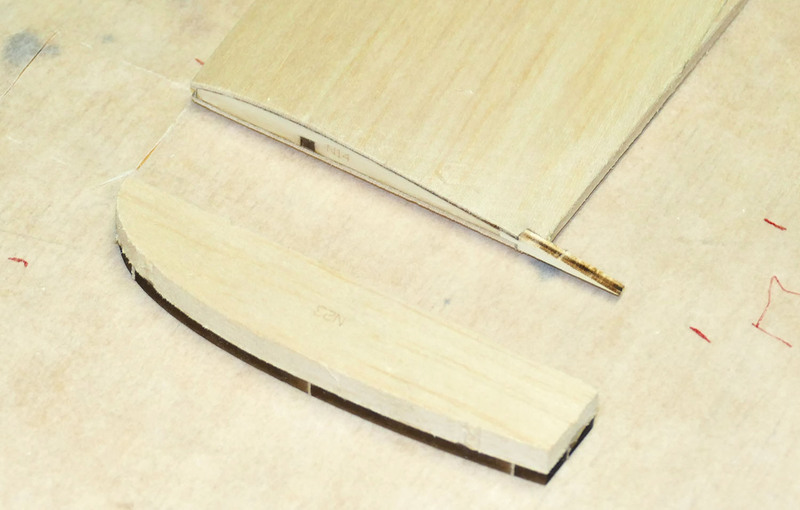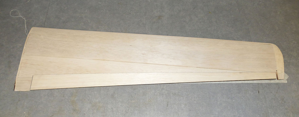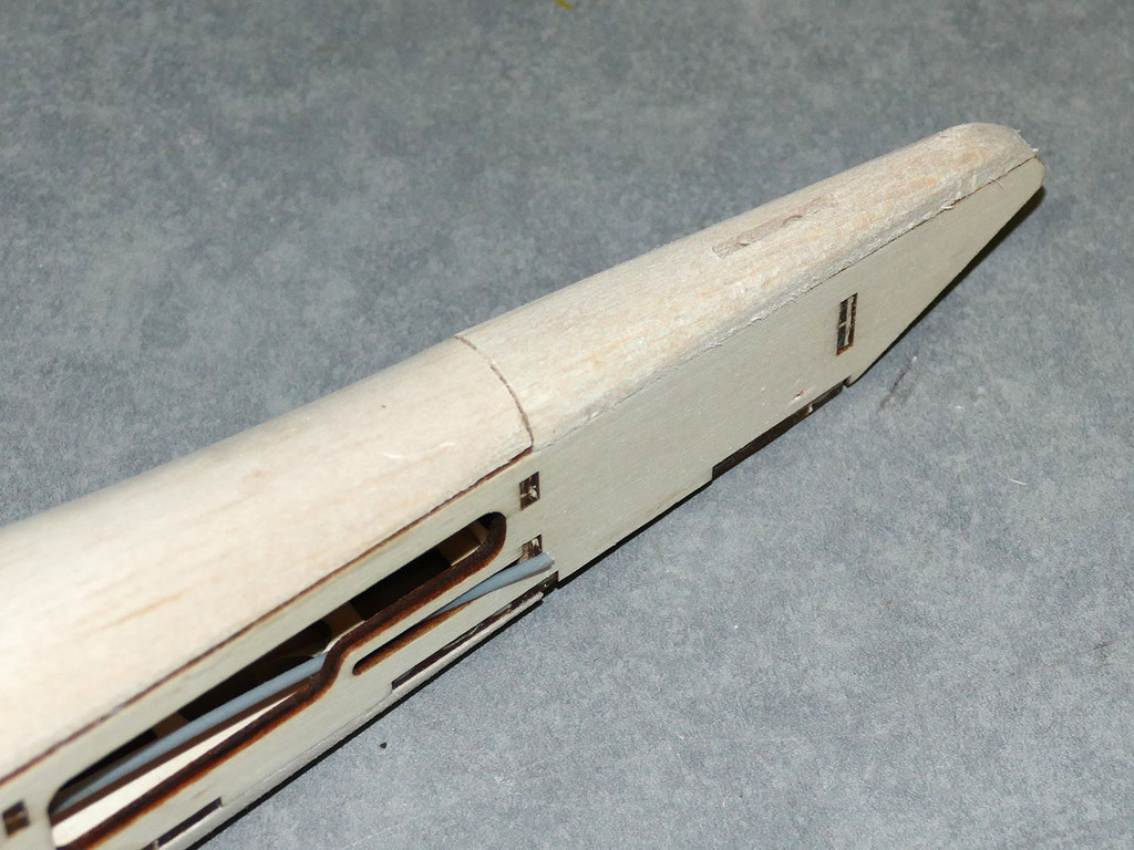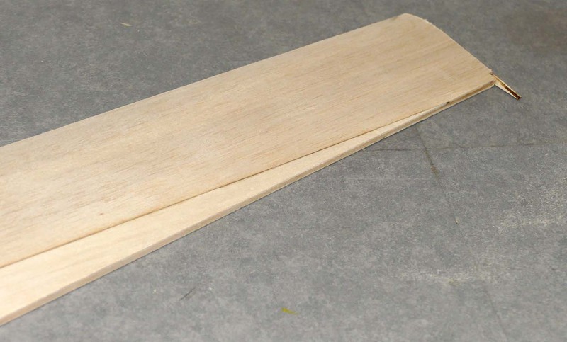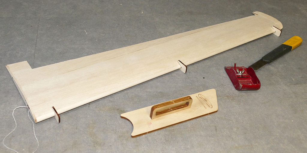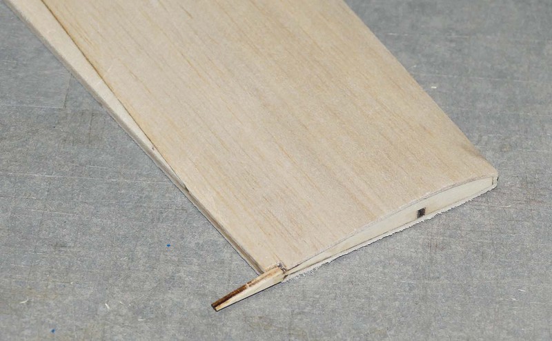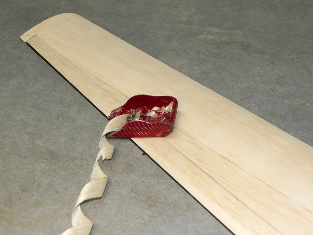 Une fois la colle parfaitement sèche, les bords d'attaque seront arrondis au rabot et à la cale à poncer. Les gouvernes de profondeur et de direction vont être amincies au bord de fuite, là encore par rabotage et ponçage, jusqu'à arriver à environ 2 à 2,5 mm d'épaisseur au bord de fuite. La face avant de chaque gouverne sera biseautée pour assurer le débattement. Pour la profondeur, ce sera un biseau simple à l'intrados. Le kit fournissant des charnières, on pourra faire un biseau double pour la gouverne de direction pour plus de réalisme. Sinon… Un biseau simple pourrait aussi faire l'affaire.