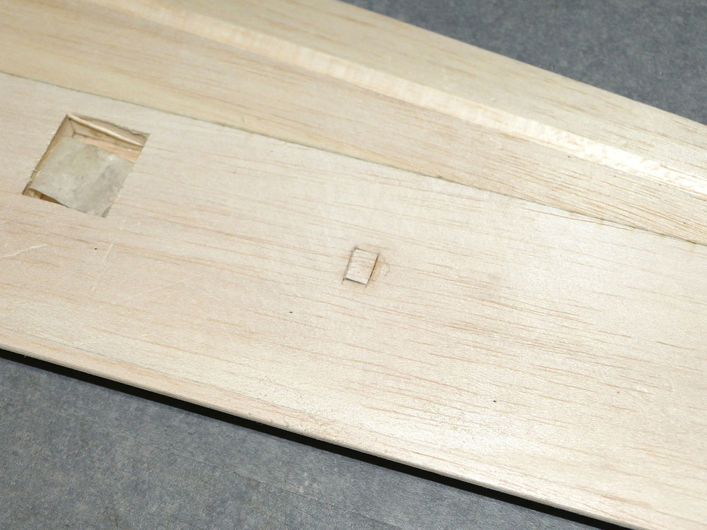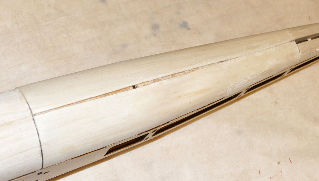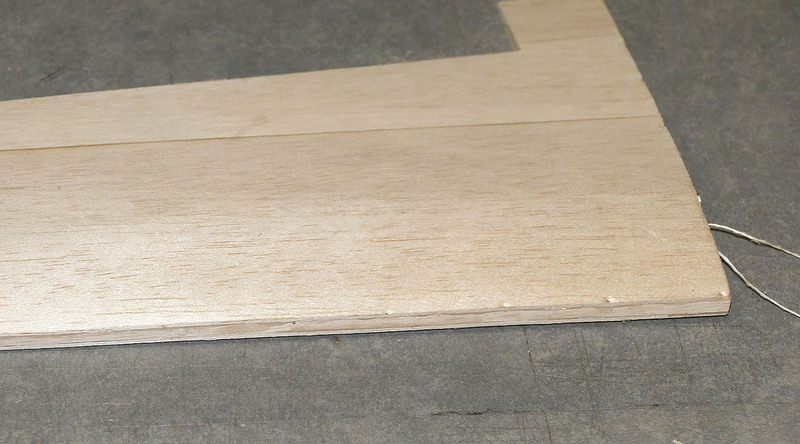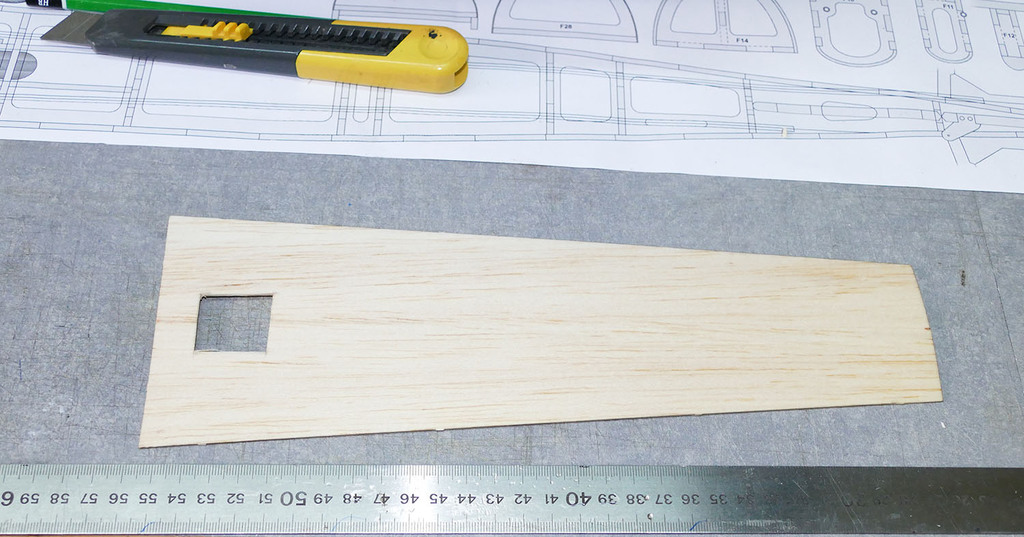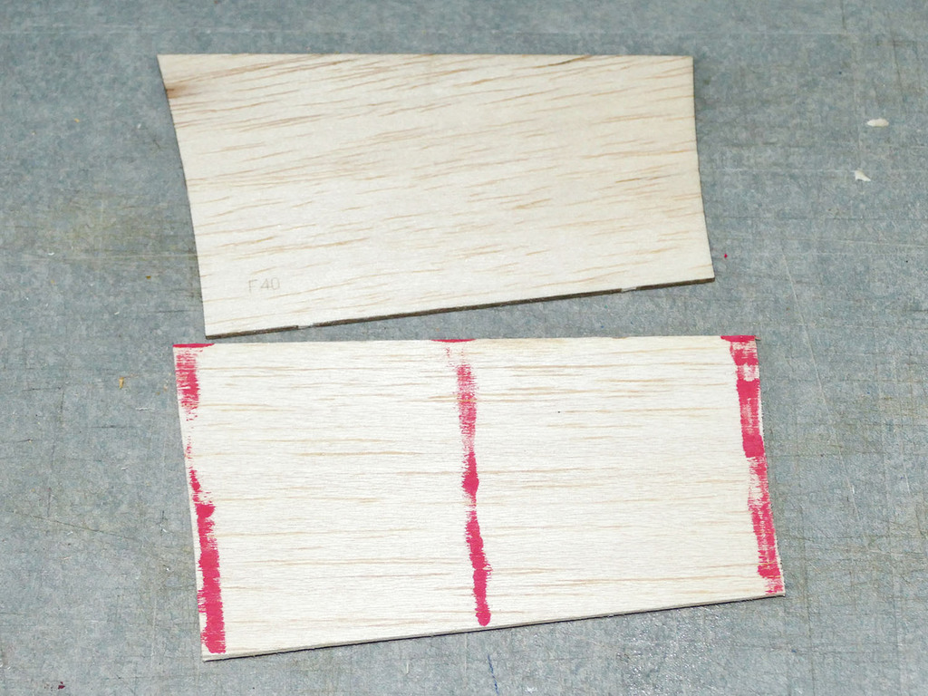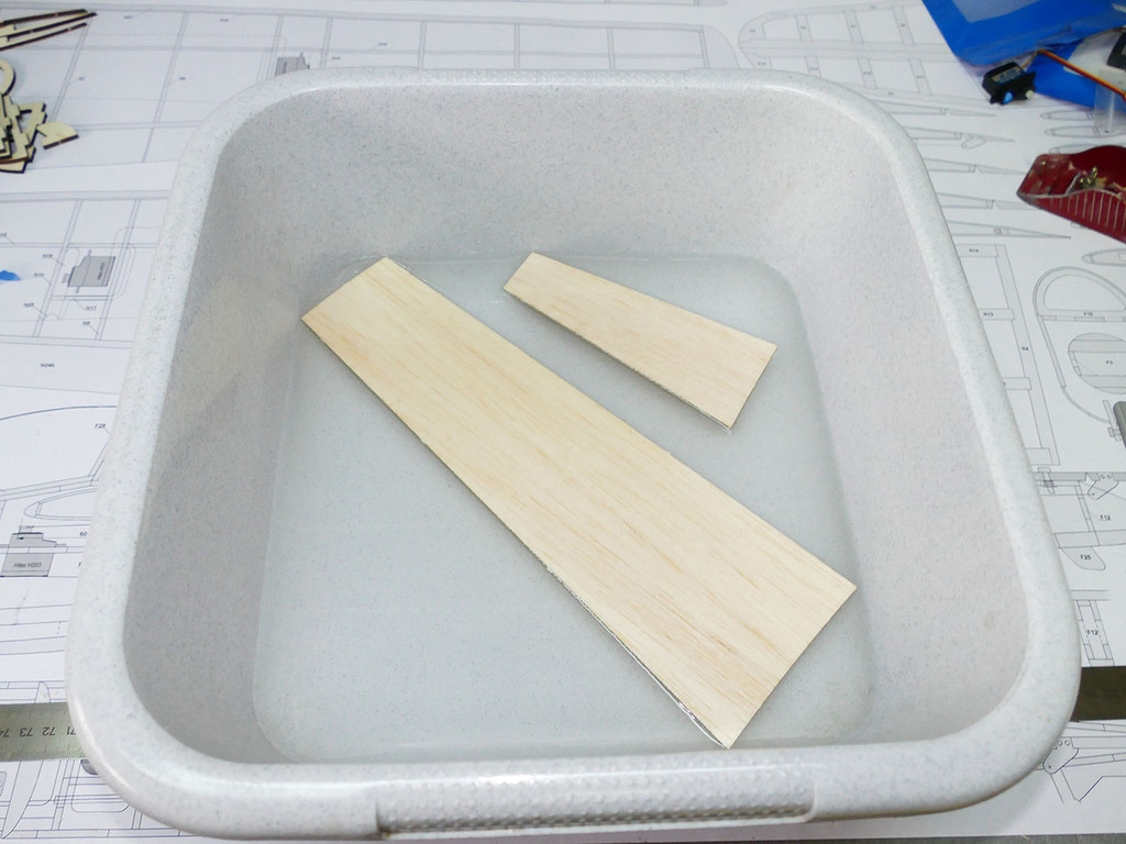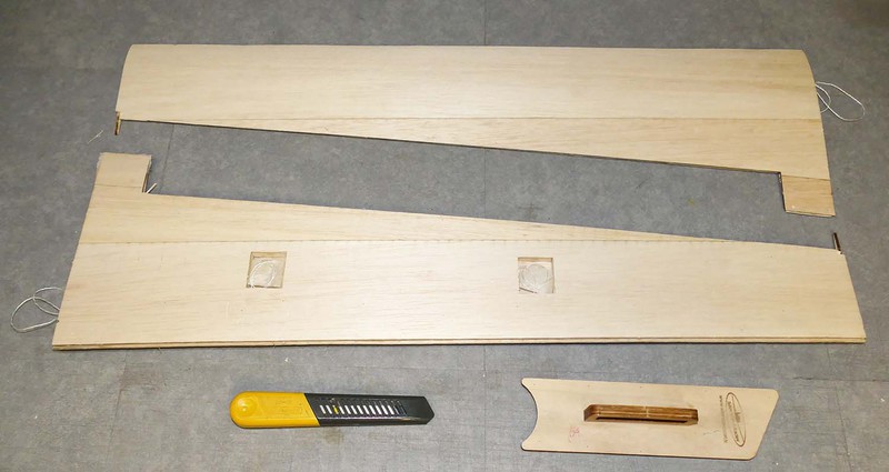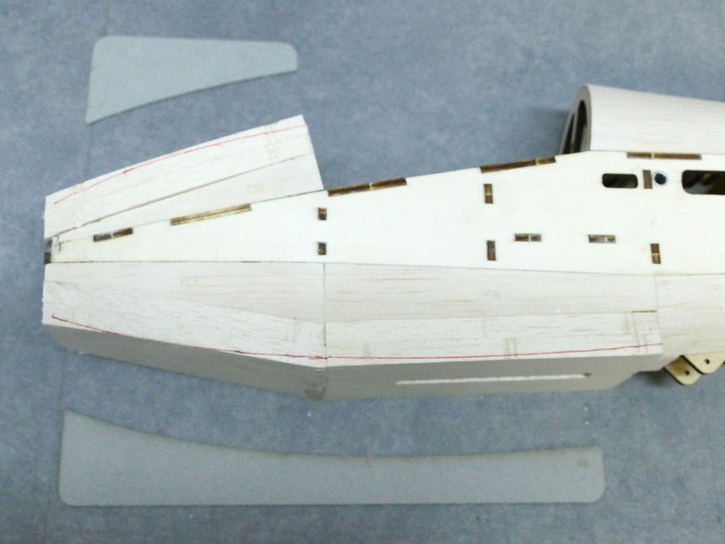 Une fois la colle parfaitement sèche, les bords d'attaque seront arrondis au rabot et à la cale à poncer. Les gouvernes de profondeur et de direction vont être amincies au bord de fuite, là encore par rabotage et ponçage, jusqu'à arriver à environ 2 à 2,5 mm d'épaisseur au bord de fuite. La face avant de chaque gouverne sera biseautée pour assurer le débattement. Pour la profondeur, ce sera un biseau simple à l'intrados. Le kit fournissant des charnières, on pourra faire un biseau double pour la gouverne de direction pour plus de réalisme. Sinon… Un biseau simple pourrait aussi faire l'affaire.