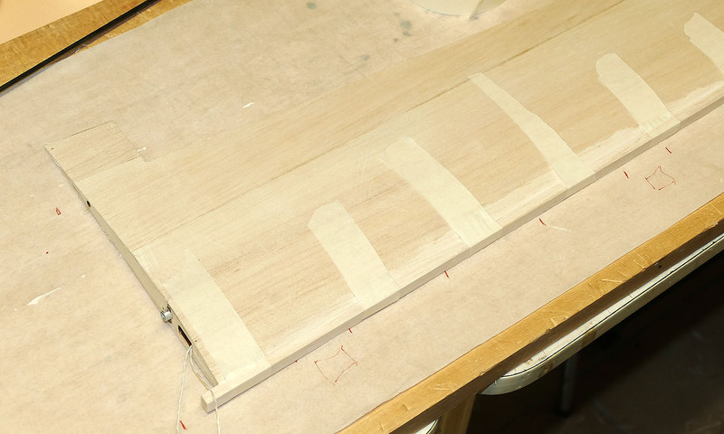 Une fois les collages qui précèdent bien secs, je sors les deux demi-ailes du chantier et je prépare les planchettes constituant les coffrages d'extrados.