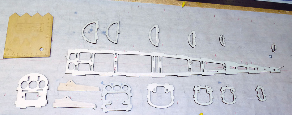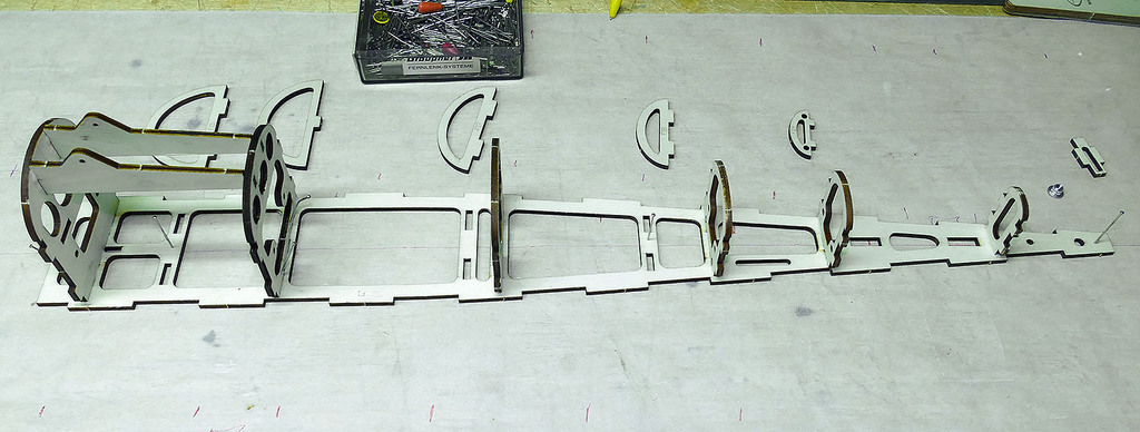 Voilà l'ensemble des pièces concernées par cette première phase : La plaque horizontale F1, les couples de F6 à F12, les supports de train F21, les flancs F2 et l'écrou de fixation de stab en alu. Les couples du dos ne sont là que pour vérifier leur cohérence et ils ne seront pas montés lors de cette phase.