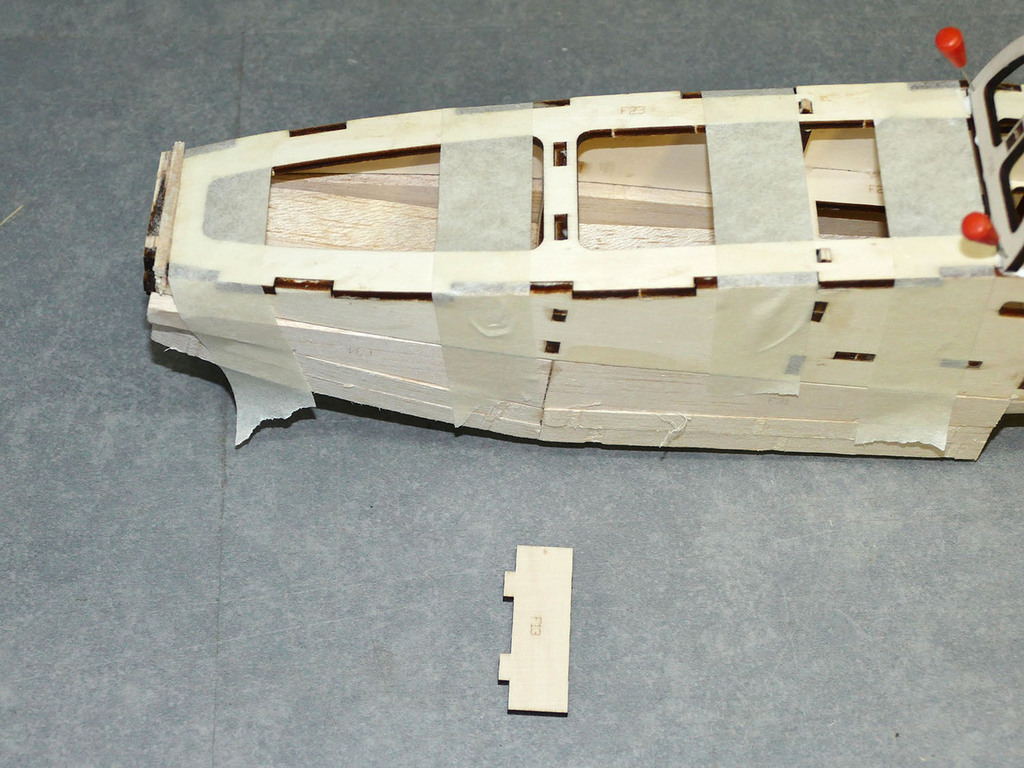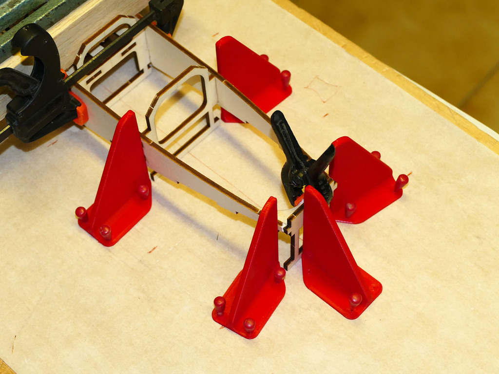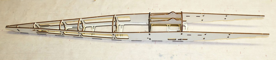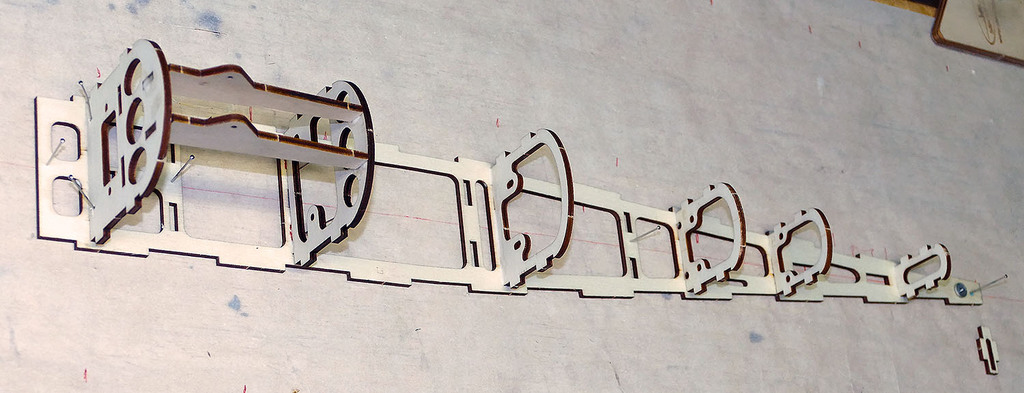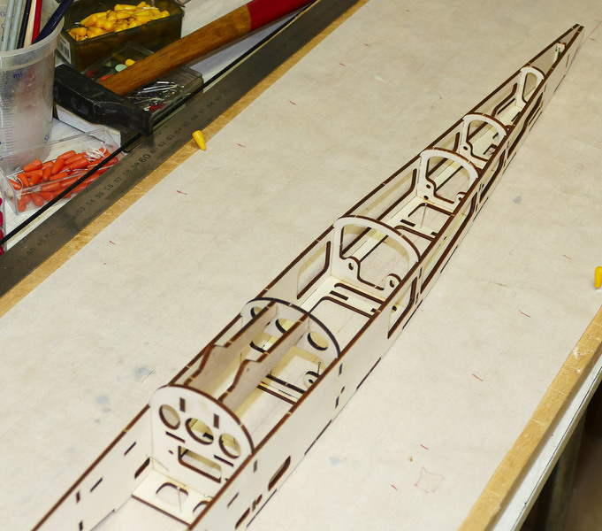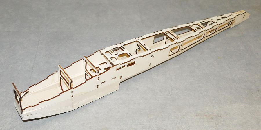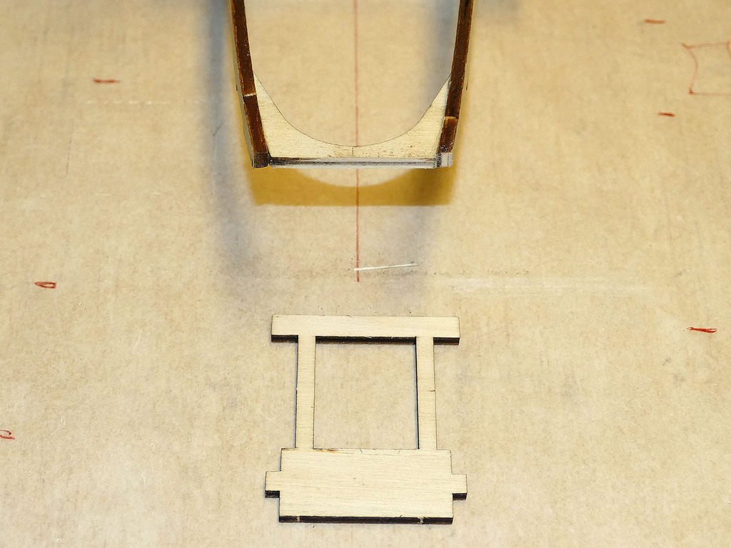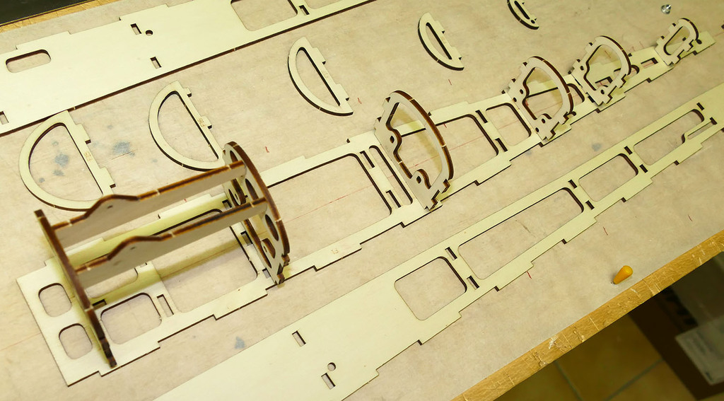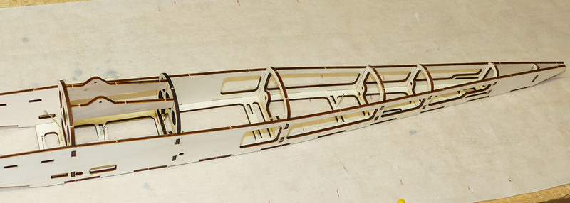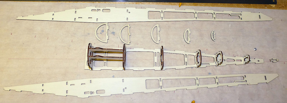 Celui-ci va se construire en deux phases : on assemblera d'abord tout le dessous, qui se monte depuis l'arrière de la verrière jusqu’à l'étambot sur une plaque horizontale (F1). Les couples plus en avant qui ne sont en principe pas en contact avec le plan de travail ont été conçus avec des "pieds" qui permettent de les positionner parfaitement. De plus, les couples ont leur milieu "gravé" au laser, ce qui permet de bien les aligner sur le chantier. Il faut bien évidemment tracer un axe de référence sur le chantier avant de commencer et fixer F1 en alignement parfait sur cet axe tracé.