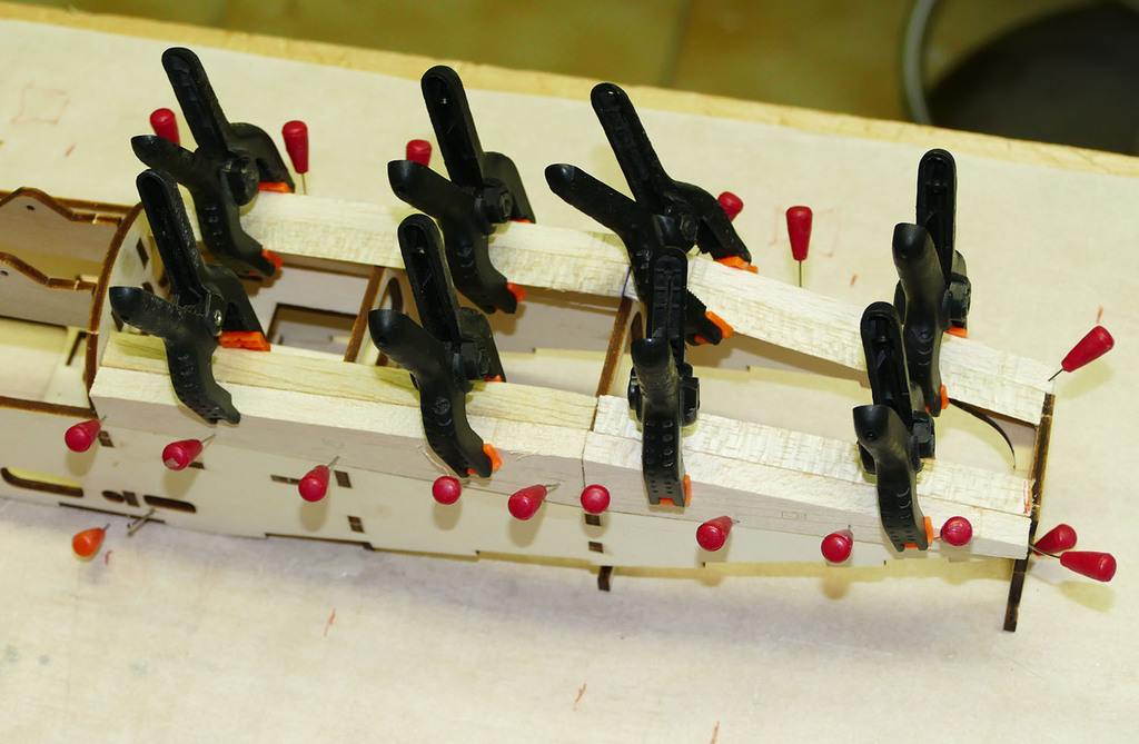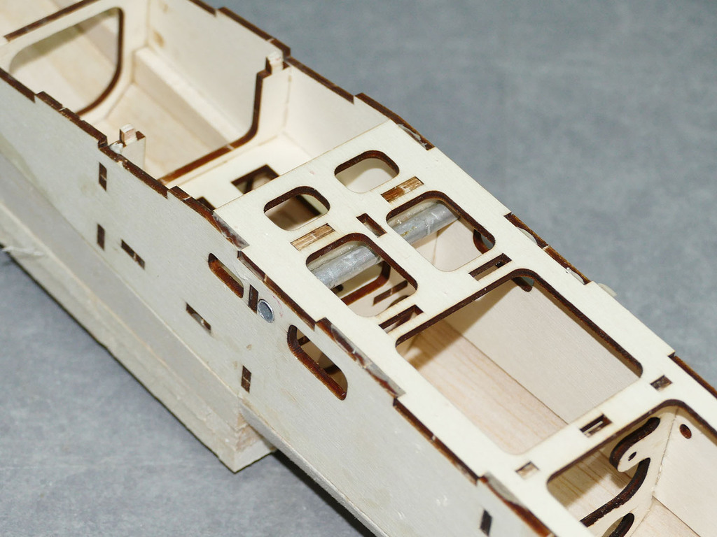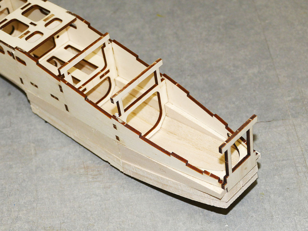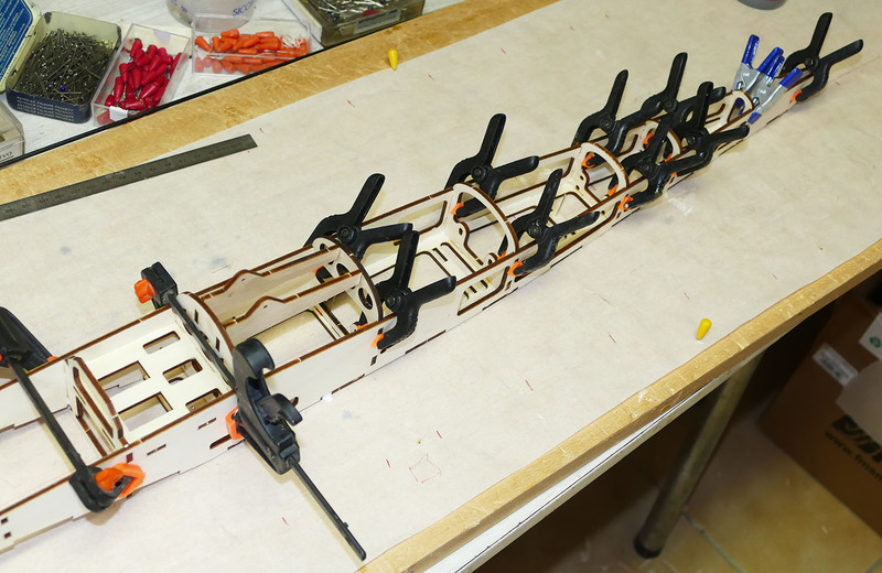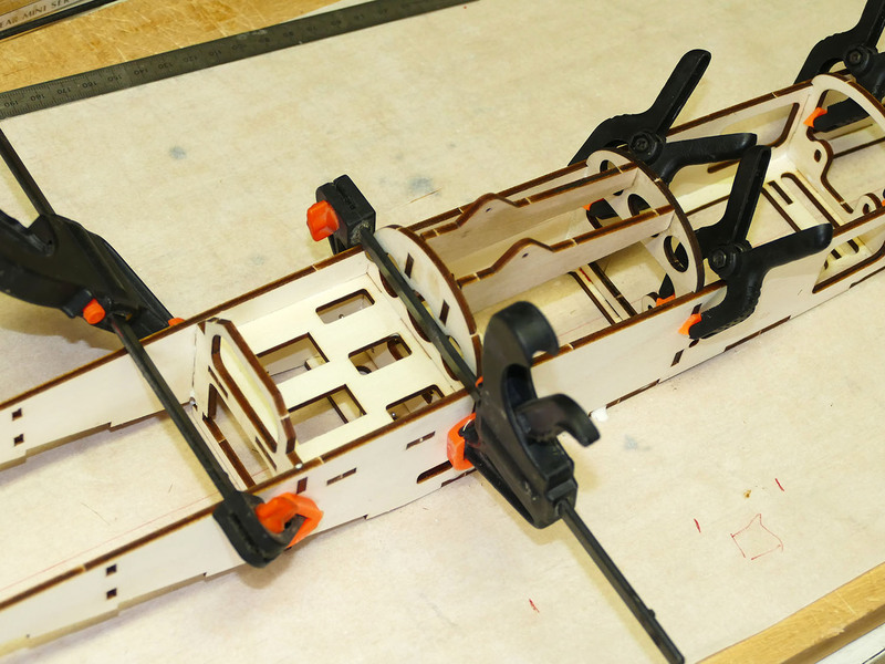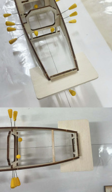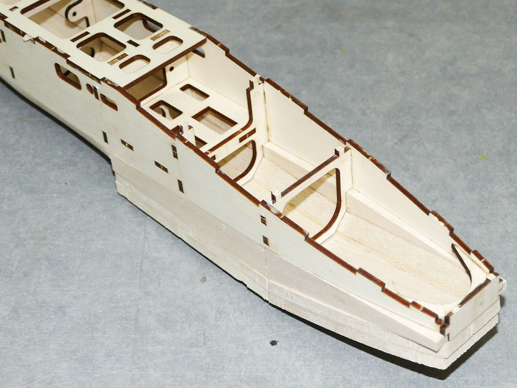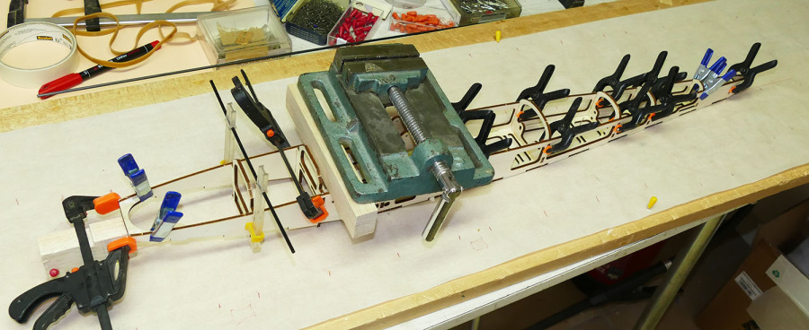 Celui-ci va se construire en deux phases : on assemblera d'abord tout le dessous, qui se monte depuis l'arrière de la verrière jusqu’à l'étambot sur une plaque horizontale (F1). Les couples plus en avant qui ne sont en principe pas en contact avec le plan de travail ont été conçus avec des "pieds" qui permettent de les positionner parfaitement. De plus, les couples ont leur milieu "gravé" au laser, ce qui permet de bien les aligner sur le chantier. Il faut bien évidemment tracer un axe de référence sur le chantier avant de commencer et fixer F1 en alignement parfait sur cet axe tracé.