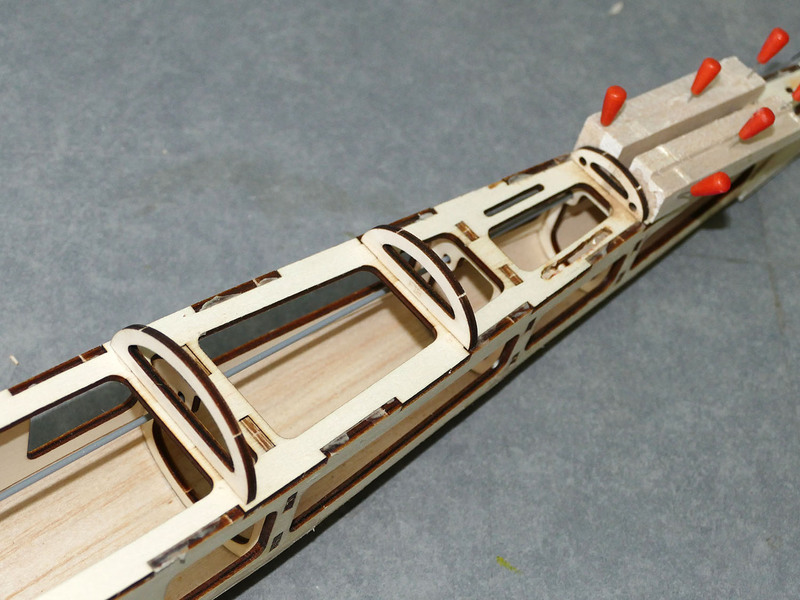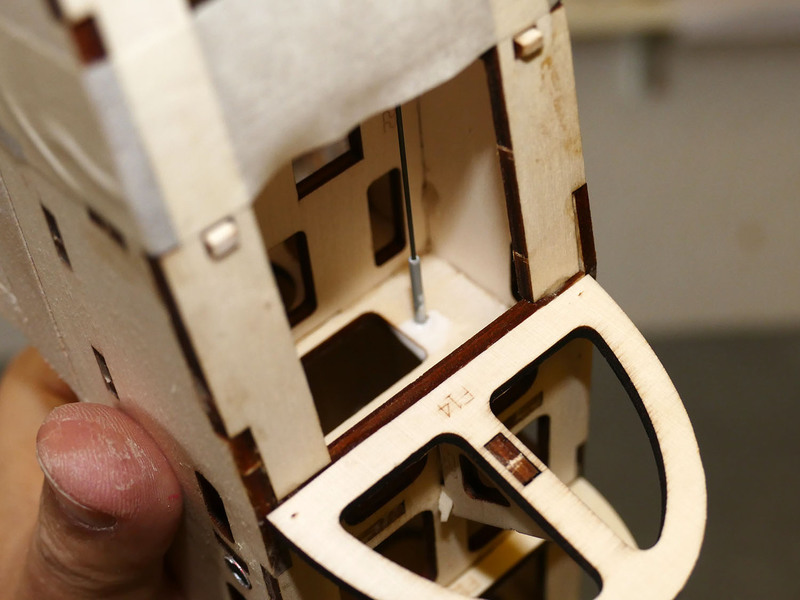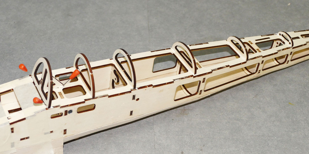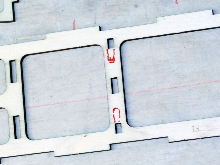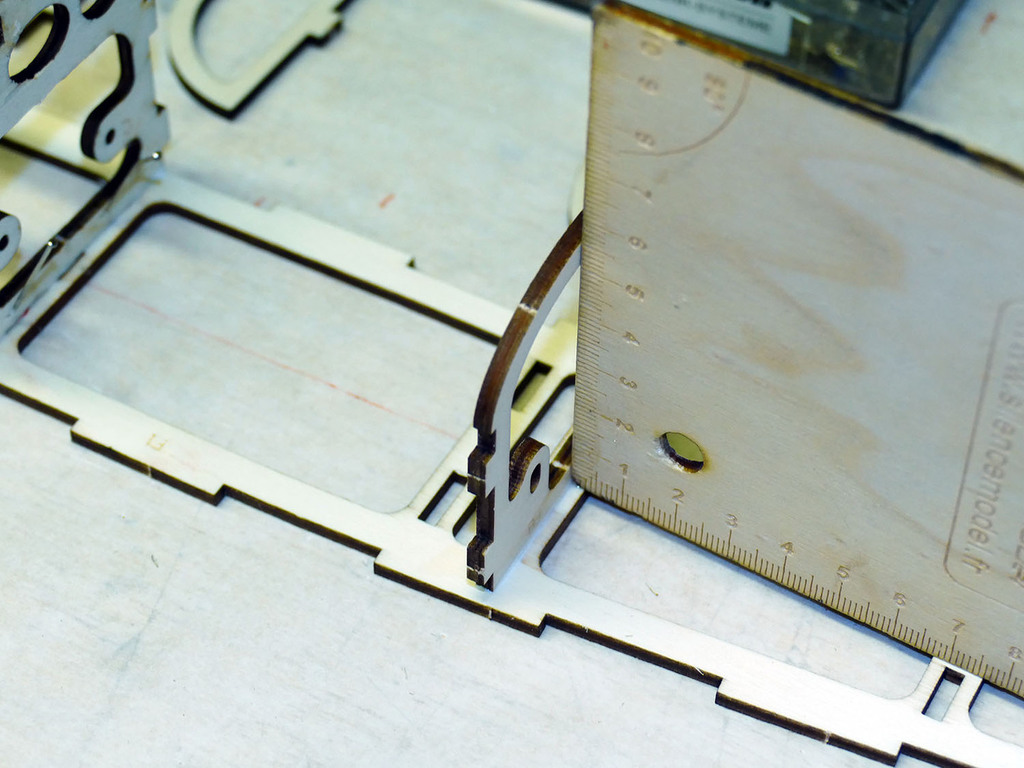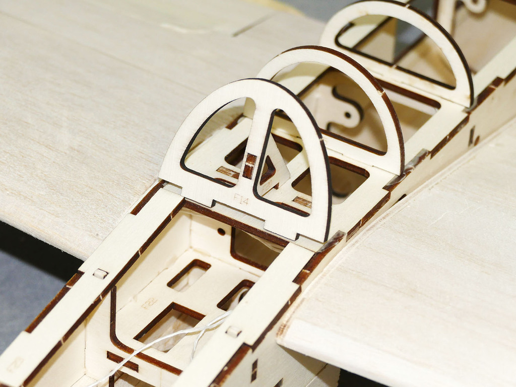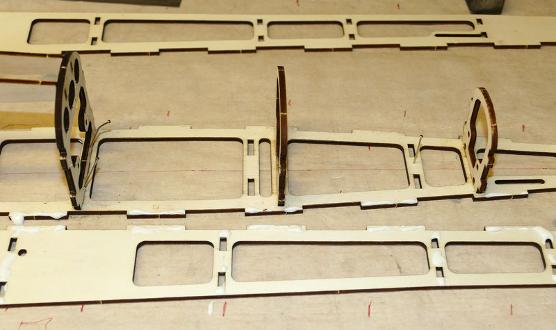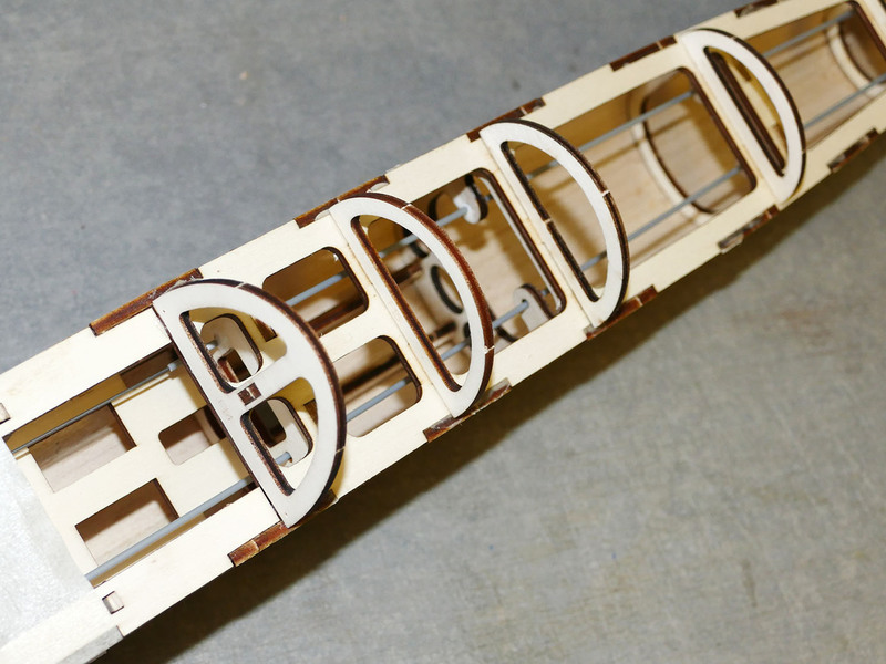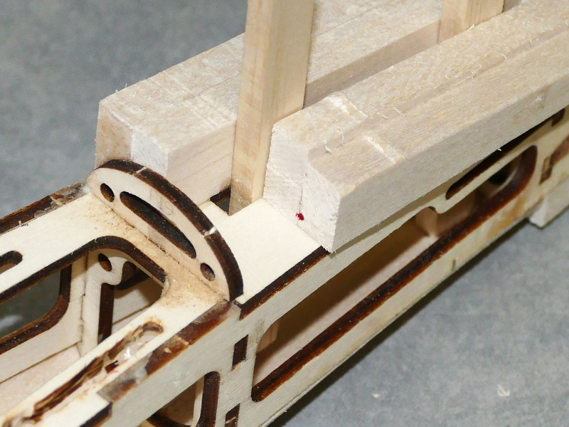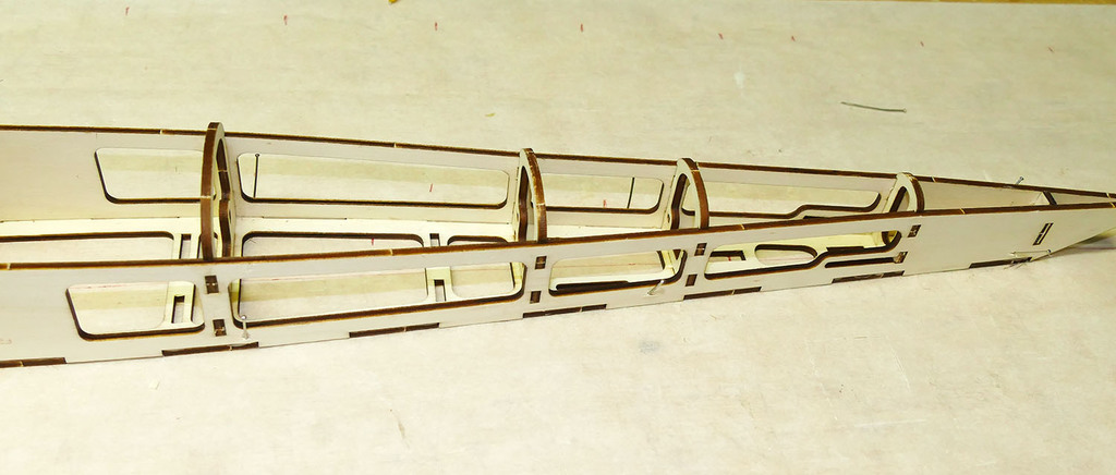 Lors de ce montage à blanc, j'ai découvert une petite erreur de découpe de mortaises pour la mise en place de F7 sur F1… Le couple supérieur F16 qui est en alignement avec F7 eut se monter, mais pas F7… La zone étant un peu fragile sur F1, je n'ai pas pris le risque de tenter d'agrandir les mortaises, j'ai redécoupé des couples F7 et F16 modifiés pour que ça se monte sur ce prototype. Bien sûr, F1 sera corrigé sur les kits de série.