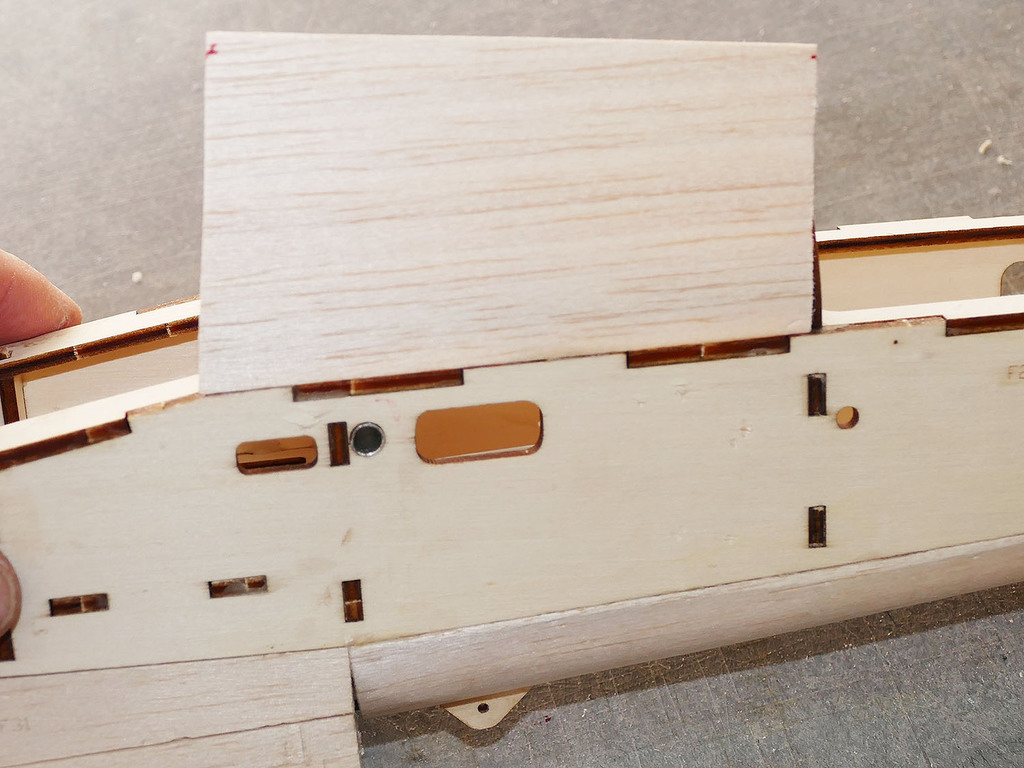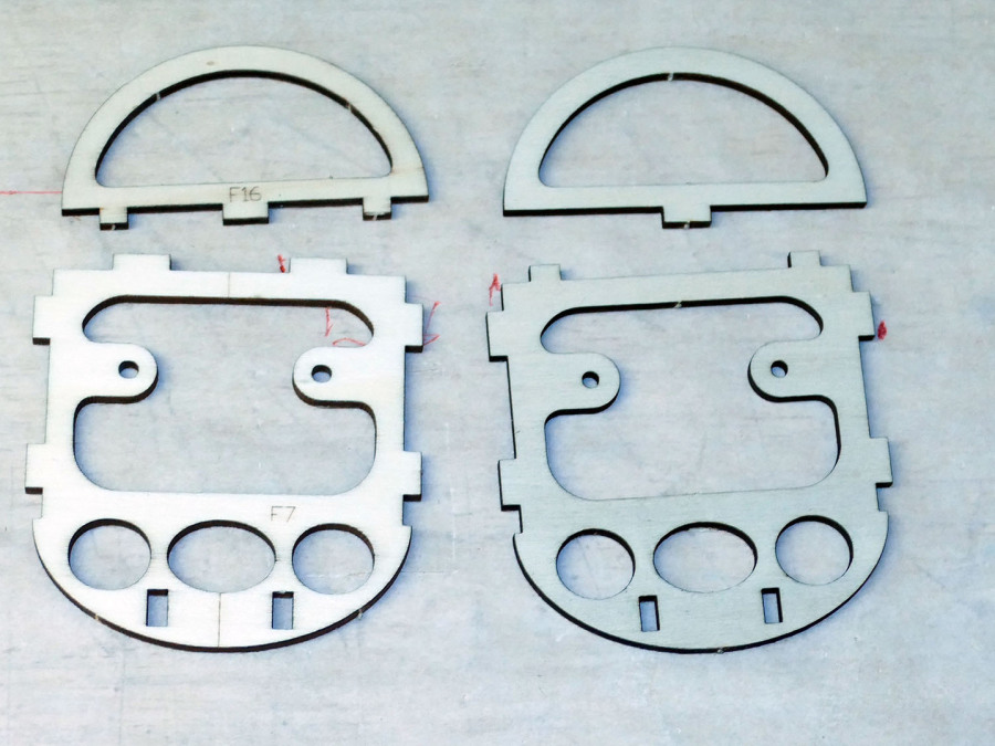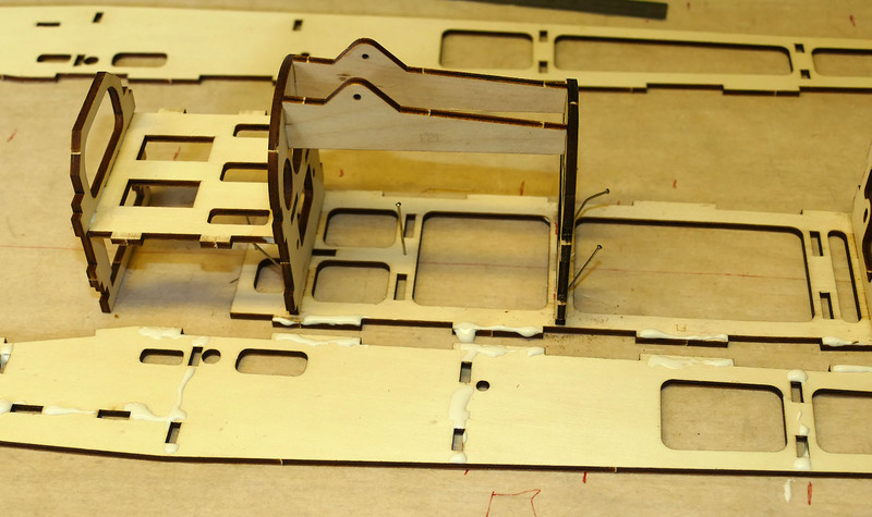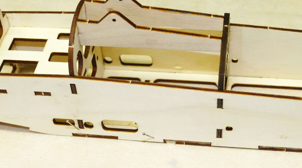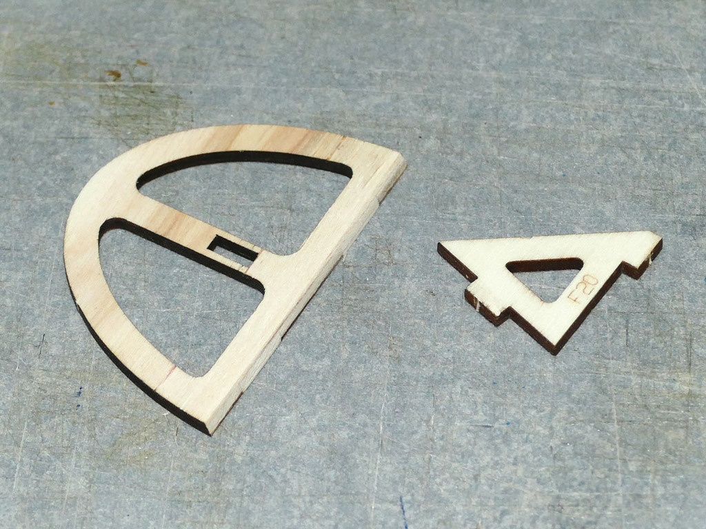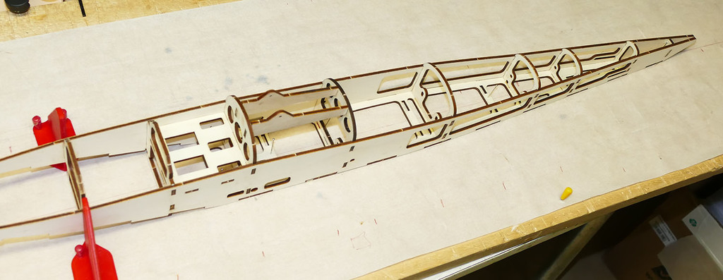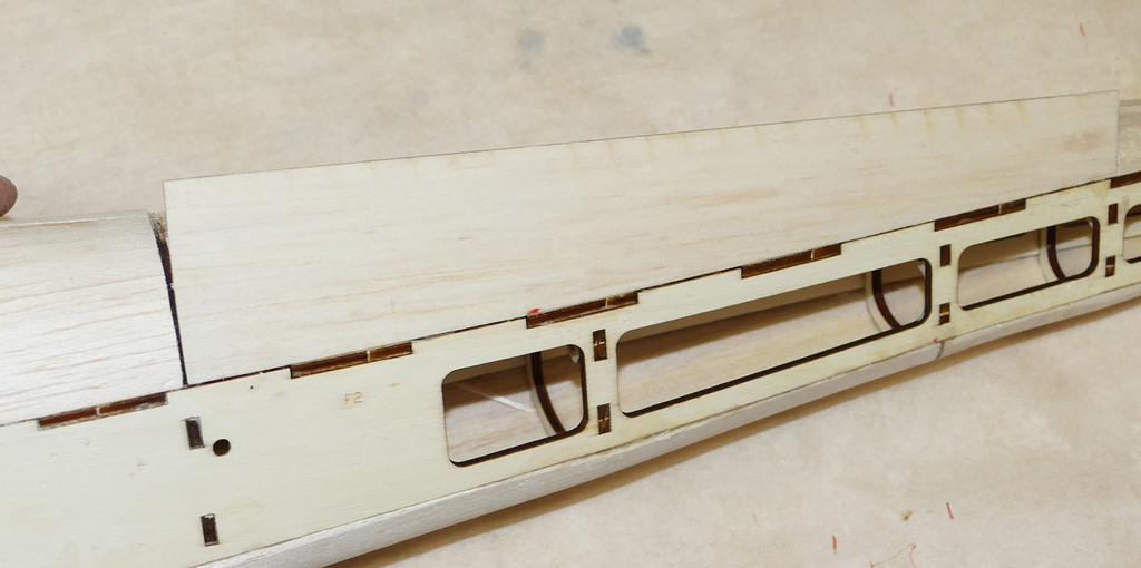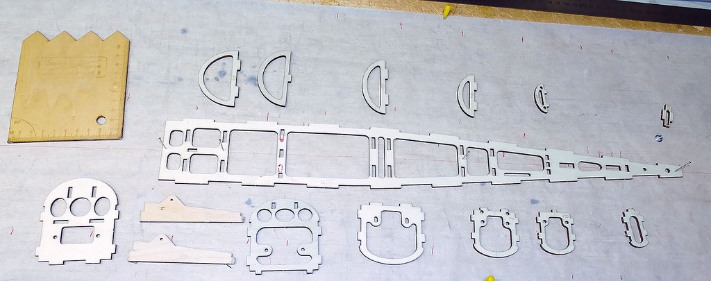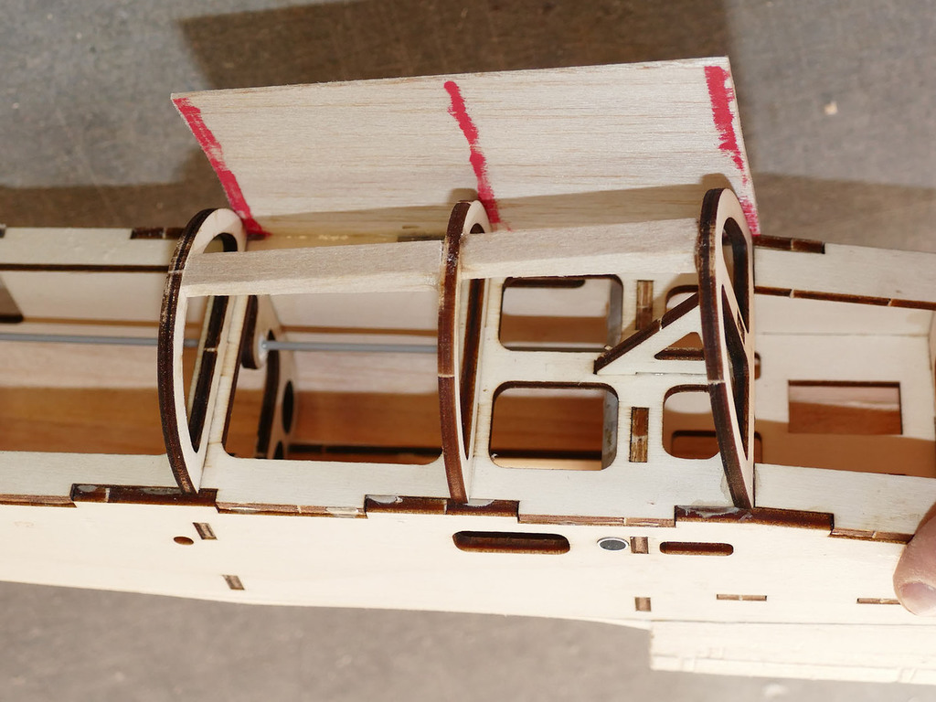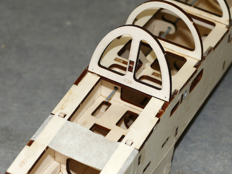 Lors de ce montage à blanc, j'ai découvert une petite erreur de découpe de mortaises pour la mise en place de F7 sur F1… Le couple supérieur F16 qui est en alignement avec F7 eut se monter, mais pas F7… La zone étant un peu fragile sur F1, je n'ai pas pris le risque de tenter d'agrandir les mortaises, j'ai redécoupé des couples F7 et F16 modifiés pour que ça se monte sur ce prototype. Bien sûr, F1 sera corrigé sur les kits de série.