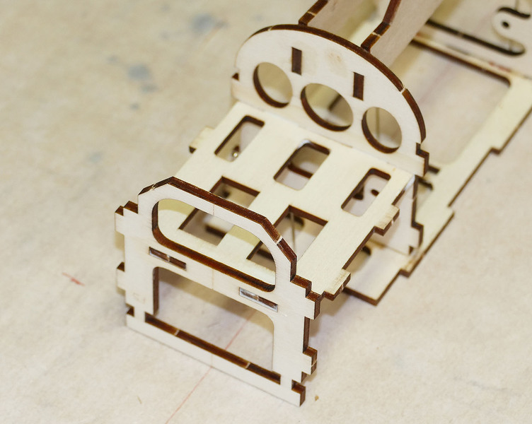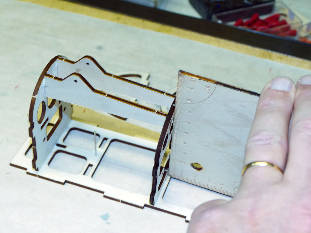 Et là, c'est vraiment du rapide et facile puisqu'il s'agit d'un simple treillis de balsa. Et comme les découpes laser sont ultra-précises, il n'y a rien à retoucher… Juste bien repérer les pièces avant de coller, car chacune a sa place et ne peut être intervertie avec une autre. Et puis, on peut assembler directement sur le plan de travail protégé, pas besoin du plan dessous, puisque grâce aux encoches, tout tombe obligatoirement à sa place. Seule précaution : placer une règle entre plan fixe et volet mobile pour que l'articulation soit parfaitement rectiligne.