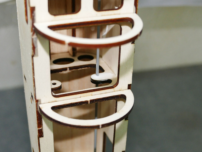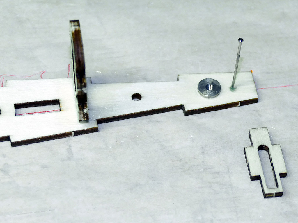 Pour la roue, il faut découper le coffrage en laissant 2 mm devant et derrière. L'axe traverse les supports en contreplaqué et des rondelles ressort viennent l'immobiliser. J'ai ajouté quelques rondelles de chaque côté de la roue pour qu'elle reste centrée et qu'elle ne frotte pas contre les supports en CTP.