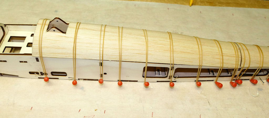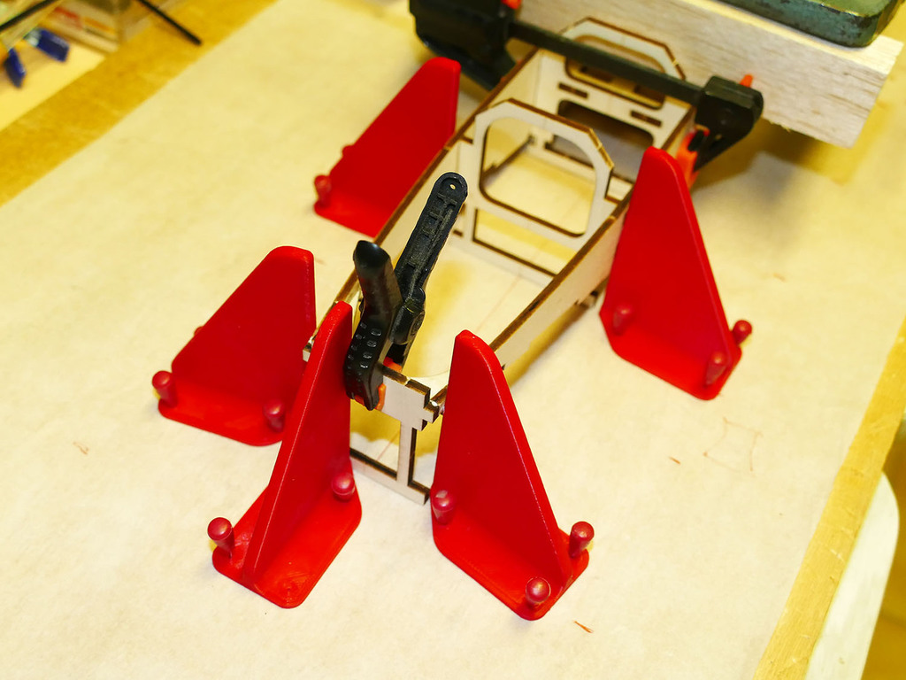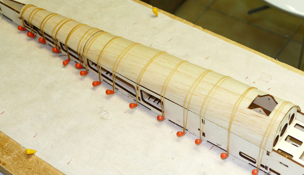 Ceci fait, je reviens sur le coffrage inférieur principal qui "manquait un peu de matière". J'ai redessiné la pièce en remplaçant les lignes droites par des arcs de cercle, donnant 2,5 mm de largeur en plus de chaque côté au milieu. Ensuite… découpe laser, et retrempette, puis remise en place avec les élastiques et attente du séchage… Il restera à ajuster la jointure et à coller ce coffrage en place pour que le dessous soit complet.