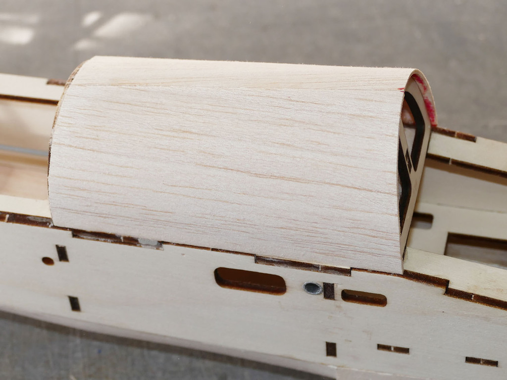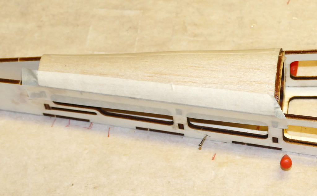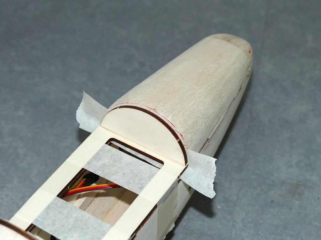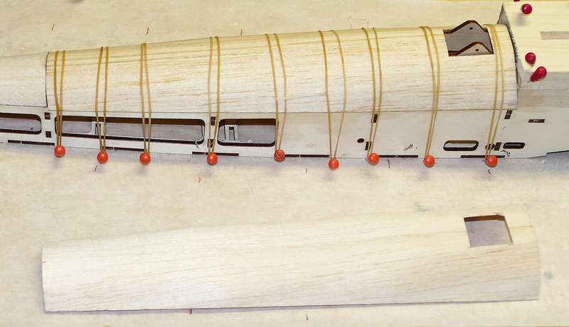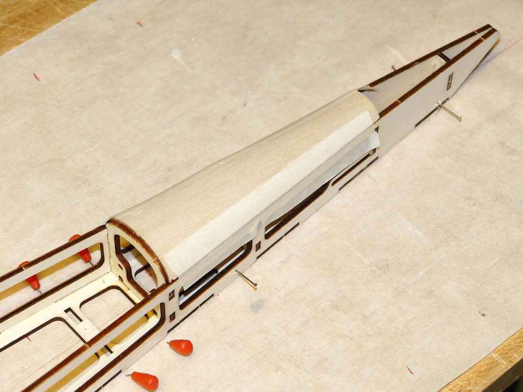 On va pouvoir passer au coffrage du dos du fuselage. Les pièces sont coupées a priori à la bonne forme, mais… entre le calcul théorique et la pratique, il y a un écart et je vais devoir modifier les pièces prévues. La partie courte juste derrière la cabine manque un peu de matière, je vais refaire les pièces par la méthode "peinture sur masking tape". La partie arrière plus longue n'est finalement pas vraiment développable et sa mise en forme demande un peu de dextérité et à détremper localement le balsa. J'ai trouvé plus facile de coller ces coffrages à la cyano medium, au risque de me faire "crier" par Chef Pascal...