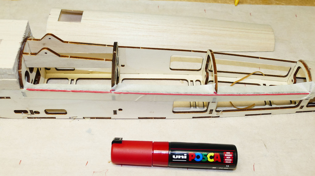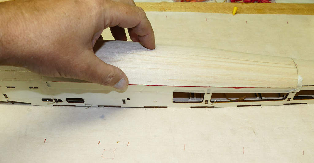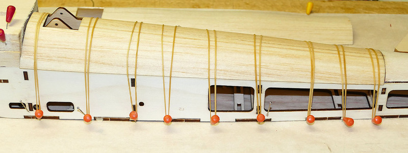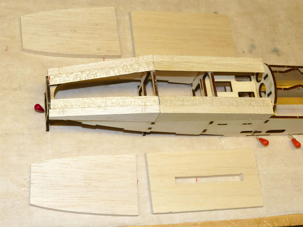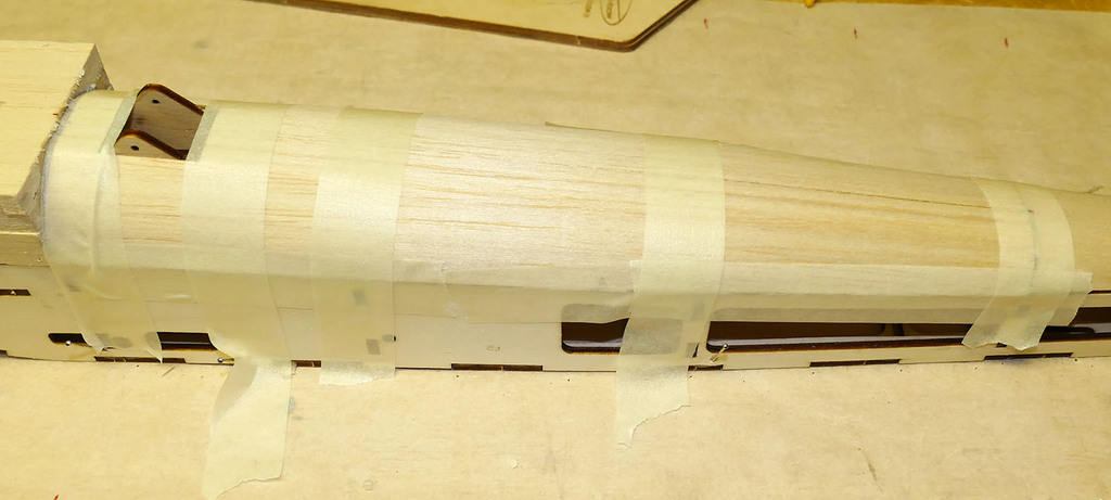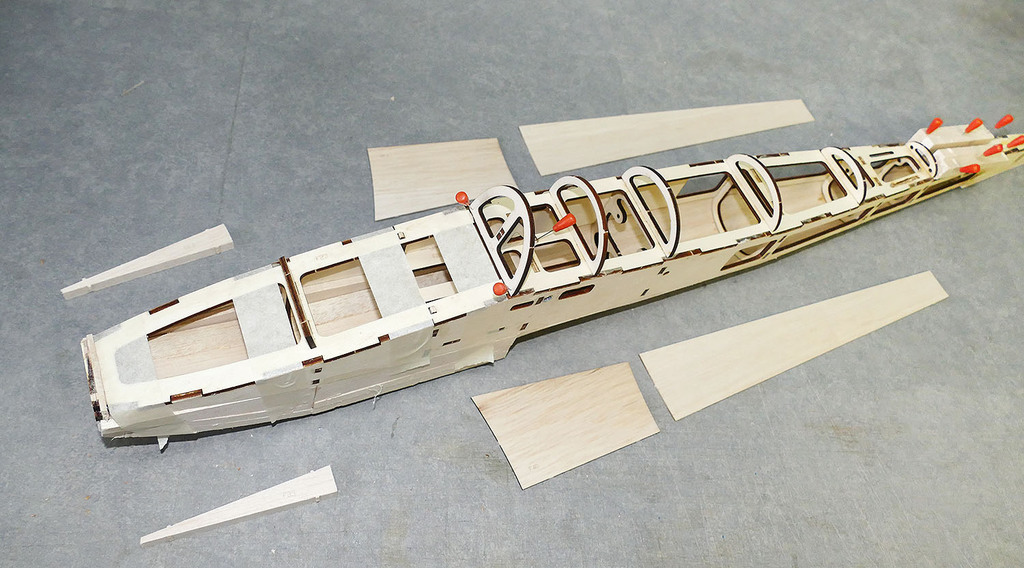 On va pouvoir passer au coffrage du dos du fuselage. Les pièces sont coupées a priori à la bonne forme, mais… entre le calcul théorique et la pratique, il y a un écart et je vais devoir modifier les pièces prévues. La partie courte juste derrière la cabine manque un peu de matière, je vais refaire les pièces par la méthode "peinture sur masking tape". La partie arrière plus longue n'est finalement pas vraiment développable et sa mise en forme demande un peu de dextérité et à détremper localement le balsa. J'ai trouvé plus facile de coller ces coffrages à la cyano medium, au risque de me faire "crier" par Chef Pascal...
