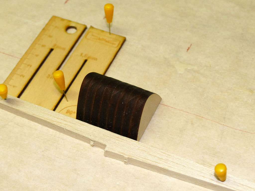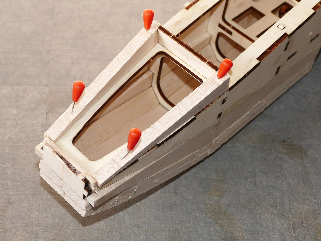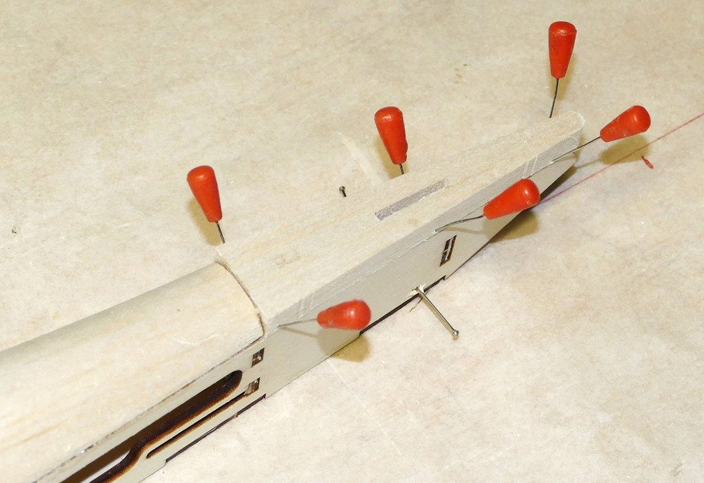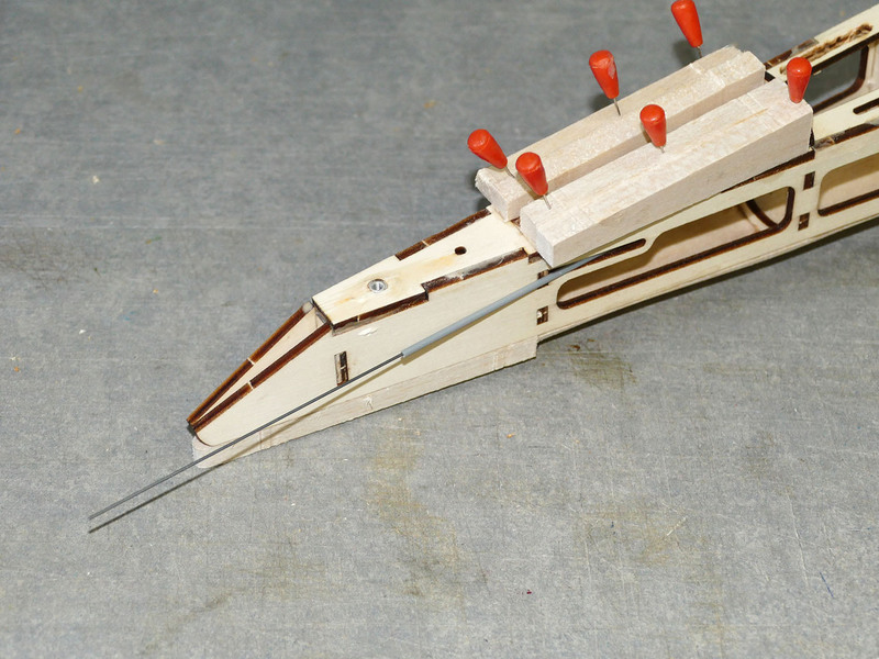 Le nez resserré étant maintenant bien sec, je peux coller le couple F3 tout à l'avant. Après quoi, le fuselage va être épinglé sur le chantier par l'extérieur avant de retirer toutes les épingles qui fixaient la plaque F1 initialement. En effet, quand on aura coffré le dessous, il ne sera plus possible d'enlever ces épingles.