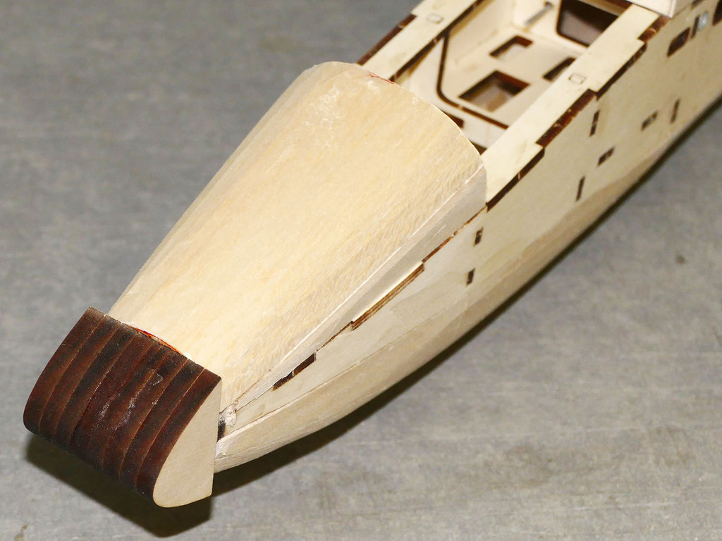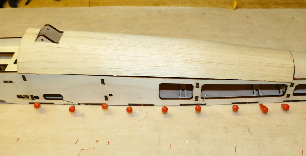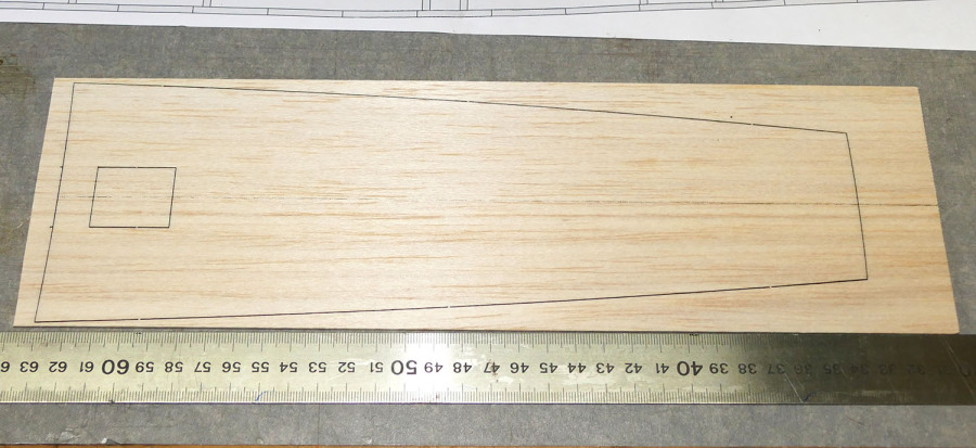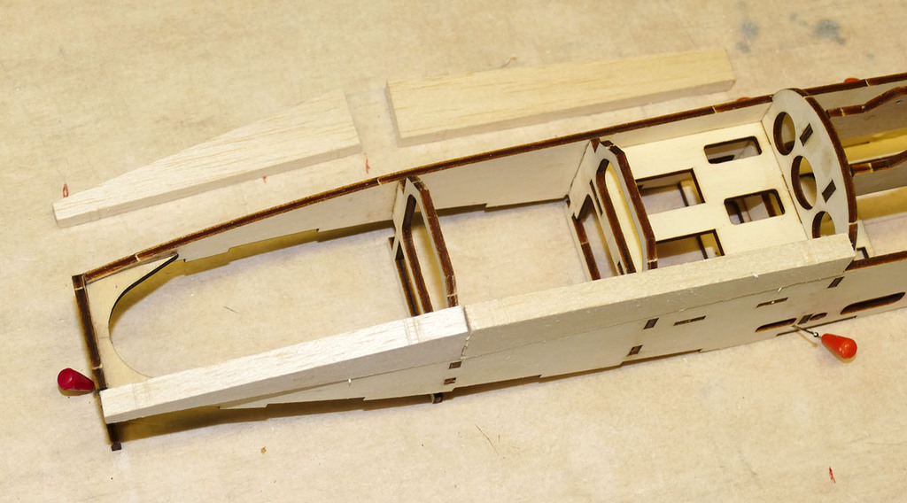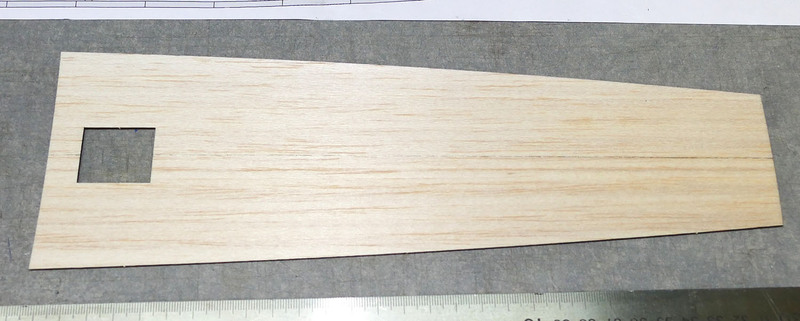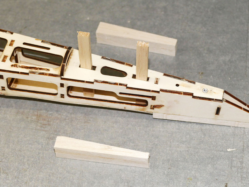 Et puis donc, je vais commencer à "fermer" le dessous du fuselage, avec des coffrages en balsa 1,5 mm sur l'arrière, et des blocs à l'avant et pour l'étambot. Allons-y !