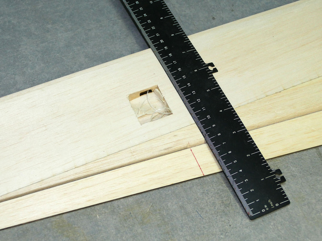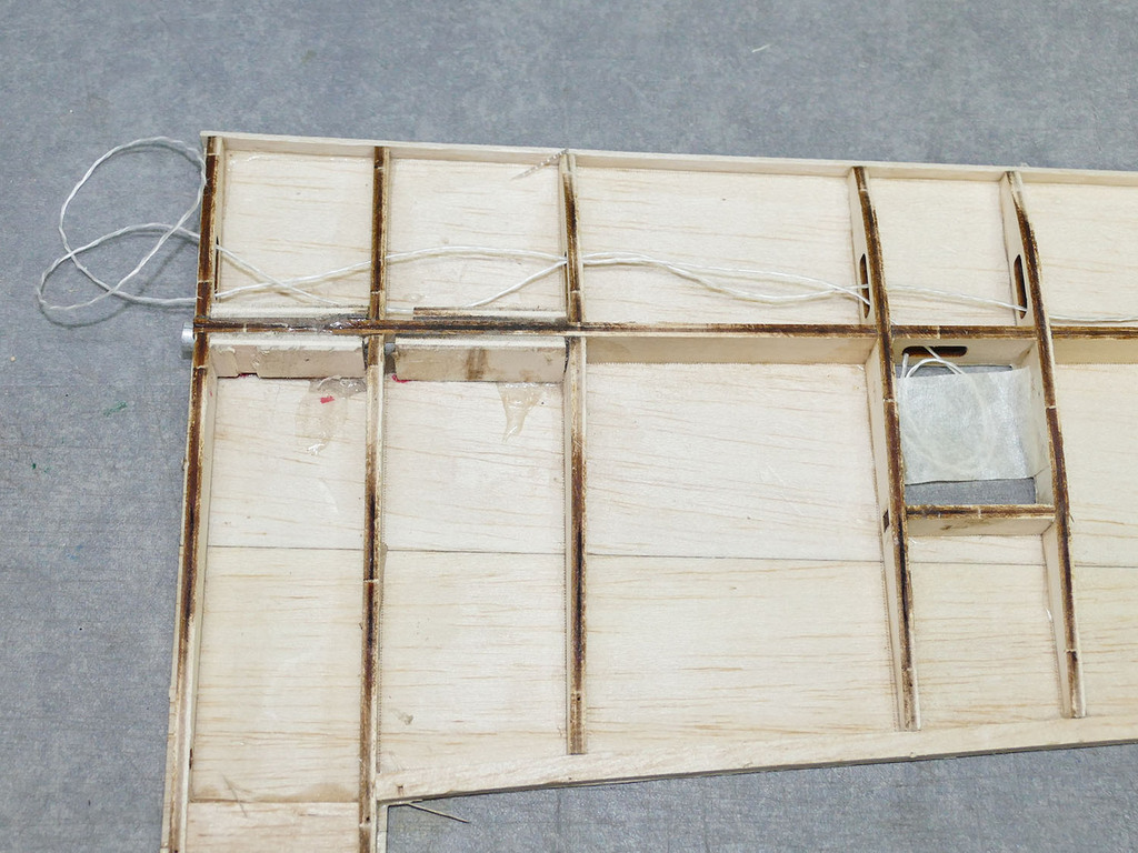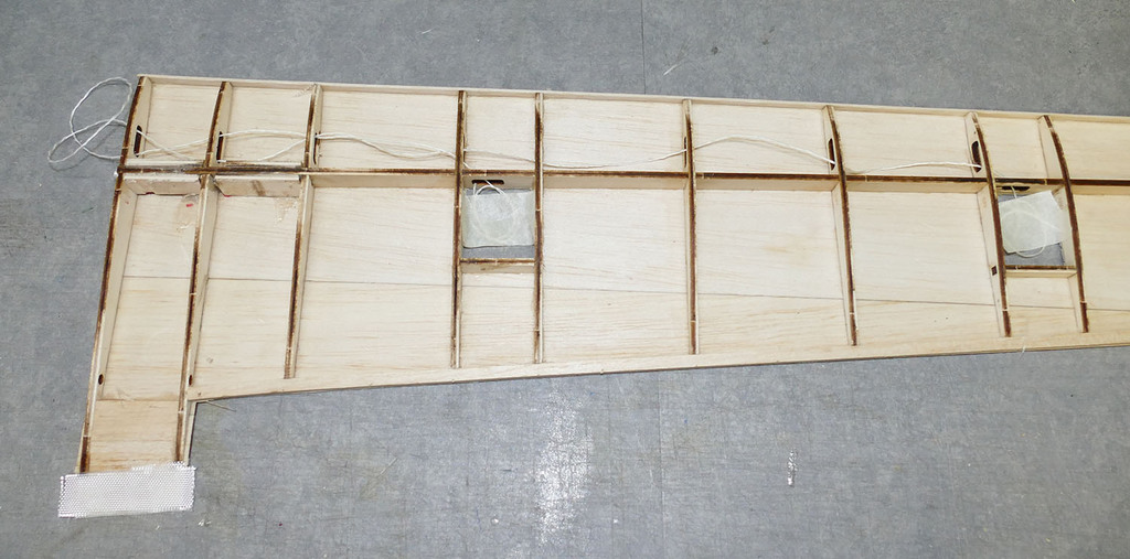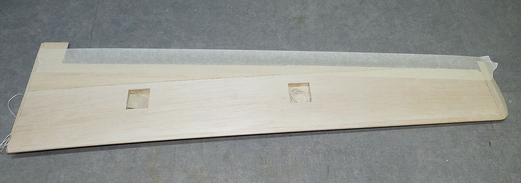 Le premier travail consiste à rassembler les 3 parties formant le coffrage d'intrados de chaque aile. On les connecte parfaitement alignés avec un masking tape côté opposé aux tracés en pointillés, on replie pour procéder à l'encollage à la blanche et on replaque bien à plat… 12 heures de séchage et nos coffrages sont prêts à recevoir les longerons, les nervures, le bord d'attaque et le faux bord de fuite. Après quoi on collera les fourreaux de clés d'ailes en tube aluminium dans les nervures d'emplanture. Avant de refermer, je découpe les ouvertures pour les puits de servos (j'ai suggéré à Silence Model que ce soit découpé laser d'origine, j'ignore si ce sera le cas sur la série à l'heure où je rédige ces lignes). Il faut aussi passer les fils rallonges pour les servos d'ailerons. Ce sera moins facile une fois l'extrados coffré ! Le tourillon arrière ne sera posé qu'après finition des ailes.
