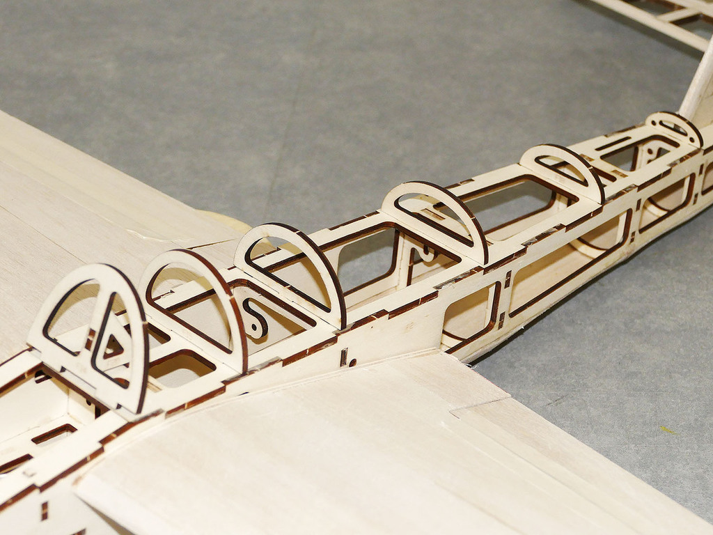 On passe au collage des longerons et des nervures. Les encoches sur ces pièces assurent la perpendicularité du longeron par rapport au plan de travail. Pour l'alignement, les marquages gravés en pointillé permettent de parfaitement tout positionner.