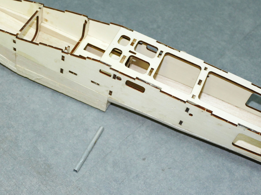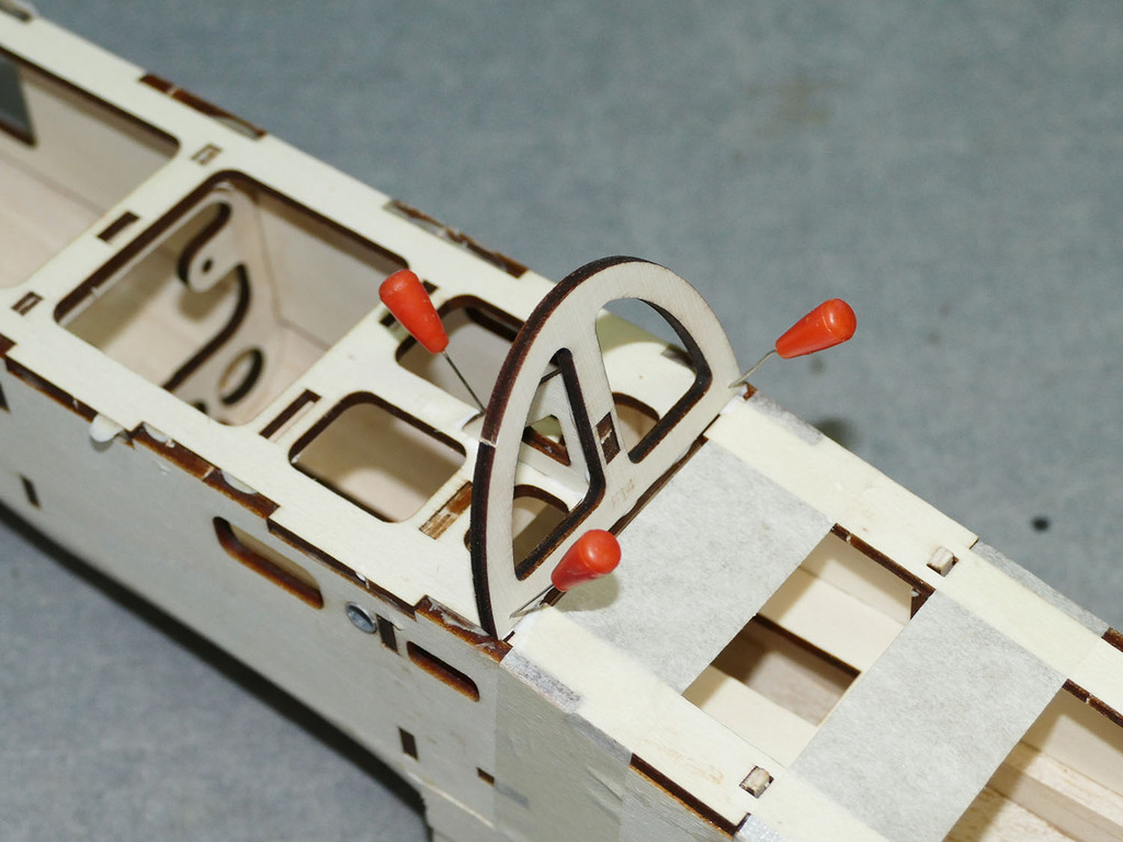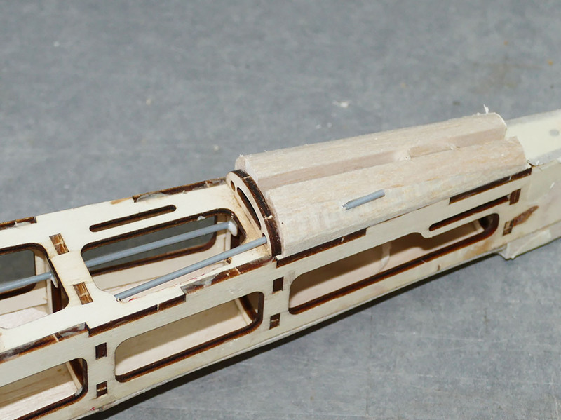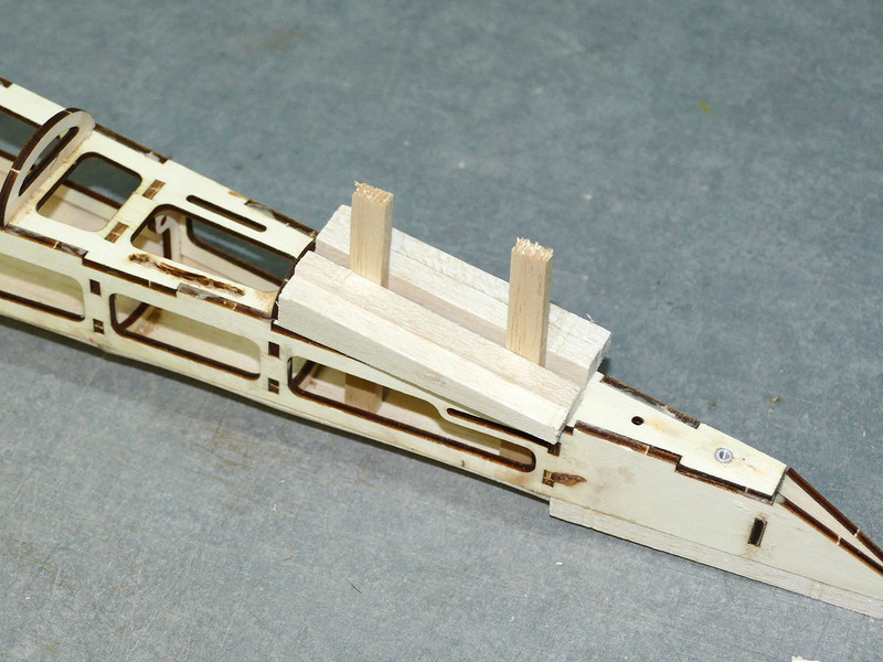 Ensuite, je me suis penché sur la fermeture de la bulle, car rien n'est prévu sur le plan. Un tourillon de bois dur à l'avant c'est du classique, mais pour verrouiller l'arrière, j'ai ajouté une gaine avec un petit support ajouté sous F1, et une sortie par le flanc gauche, sous le bord de fuite de l'aile. Un flexible muni d'une petite "boule" à cette sortie coulissera dans la gaine et viendra verrouiller le cadre de verrière qui va recevoir lui aussi une petite pièce de contreplaqué avec le trou en face de la gaine.
