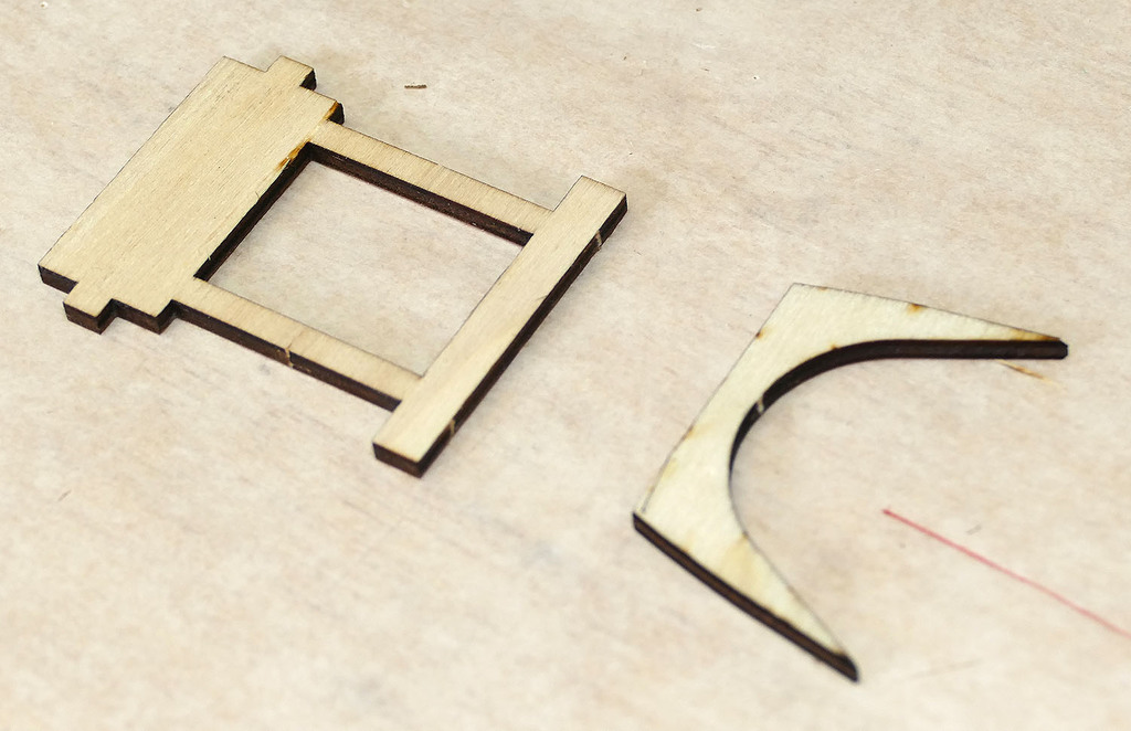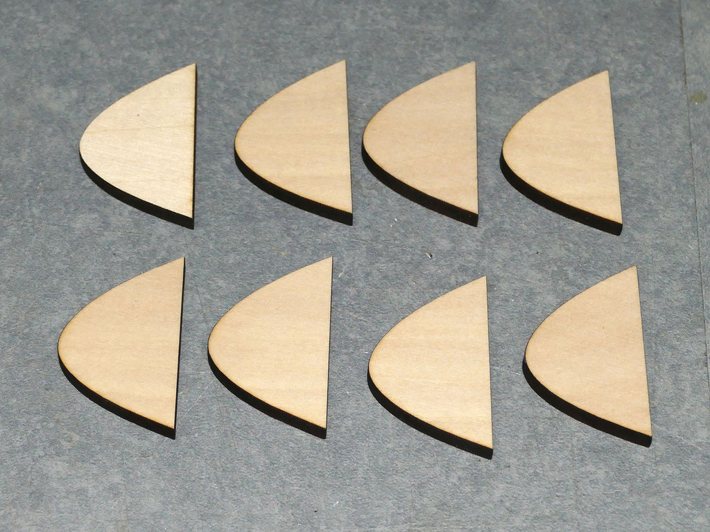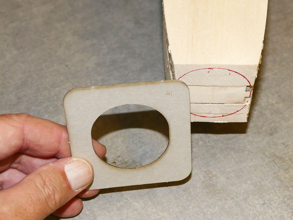 Une planchette en cartonnette découpée laser fourni les gabarits pour faciliter la mise en forme des blocs de nez à raboter et poncer.