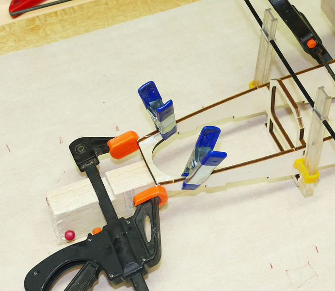 On va continuer avec la pose des flancs, tout en ajoutant les couples avant qui ne reposent pas sur la plaque F1 et la platine servos. L'étude du plan et des pièces montre une particularité pour le couple le plus avant (F3) : il est à coller devant la face avant des flancs et pas "pincé" entre les flancs comme tous les autres. Ceci complique un peu son collage, car la surface de collage est très faible et les flancs qui sont cintrés à l'avant vont pas mal "tirer" sur le collage, tant que la plaque F23 et les blocs du dessous ne seront pas en place… J'ai cherché comment faire pour que ça tienne, et diverses options étaient possibles, comme mouiller les flancs pour les former et qu'ils ne "tirent" plus, attendre plus tard quand on collera la plaque de dessus avant F23 pour coller ce couple, ou encore coller tout de suite les blocs du dessous… Finalement, j'ai choisi de fabriquer une pièce supplémentaire qui va tenir les flancs avec une bonne surface de collage à l'avant. Quand cette pièce sera bien sèche, je pourrais coller F3 facilement. Je ne sais pas si cette solution sera retenue pour la série, mais elle me semble plus facile. On pourrait même ajouter un tenon et une mortaise pour l'imbriquer dans F3… J'y ai pensé trop tard… Bon, avant tout, on va faire un montage à blanc et coller si tout est bon.