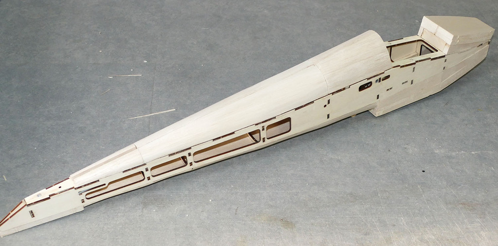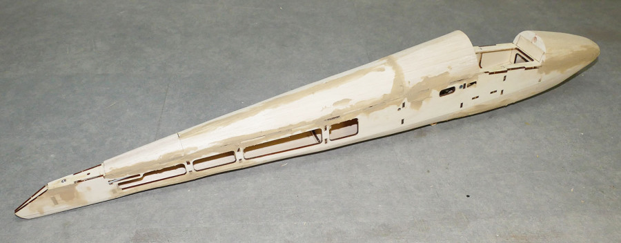 A ce stade, le ponçage initial se termine, mais il y aura encore à le fignoler une fois le cadre de verrière préparé. Un léger masticage bouchera les éventuelles imperfections avant le ponçage final. (Note : la dérive n'est pas collée à ce stade, elle est juste posée en place pour la vue d'ensemble.)