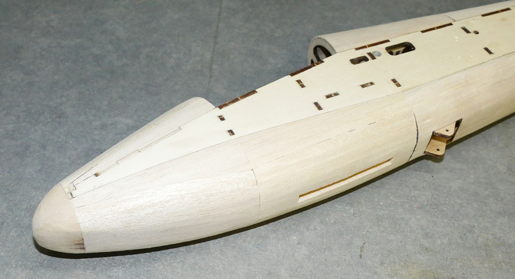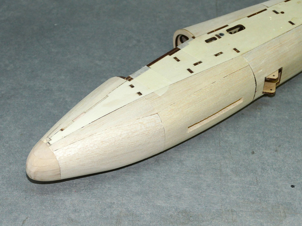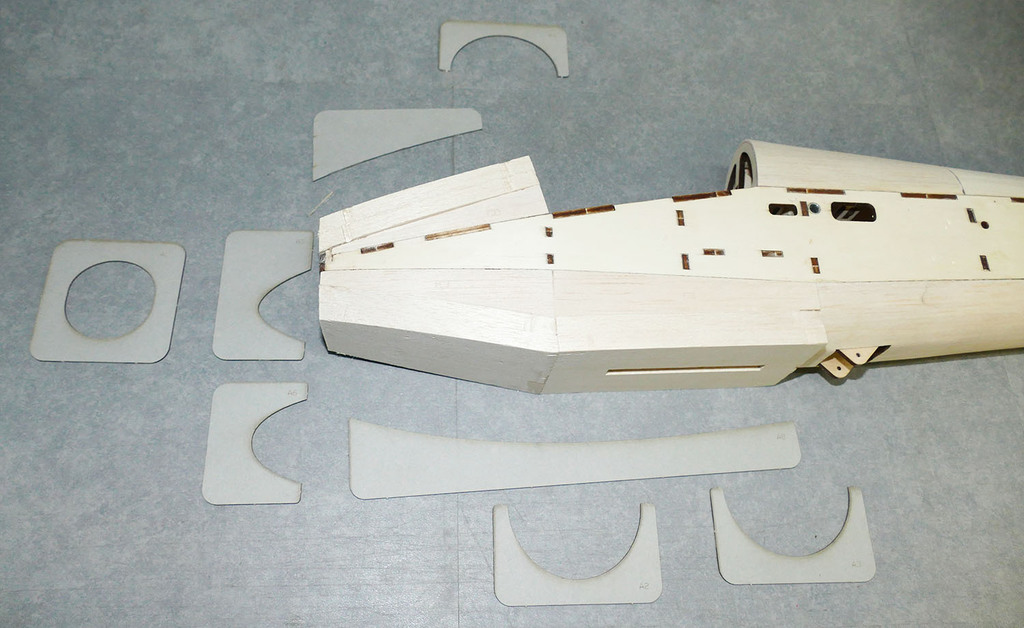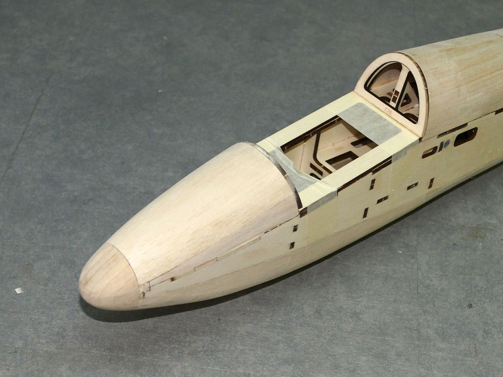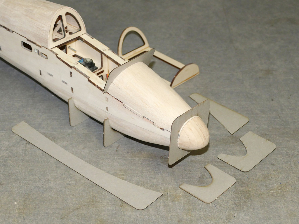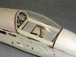 C'est le moment de préparer le cadre de verrière. Il se compose de 3 pièces en contreplaqué qu'il faut ajuster et biseauter avant de les coller ensemble. Une fois ce cadre collé, on pourra passer au ponçage final du fuselage en donnant sa forme définitive au nez. Les gabarits en carton fournis dans le kit permettent de bien respecter les formes et montrent à quel point il faut encore poncer ! Mais au final, le museau a belle allure.