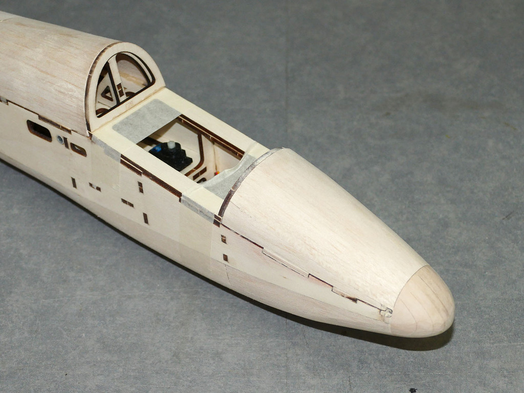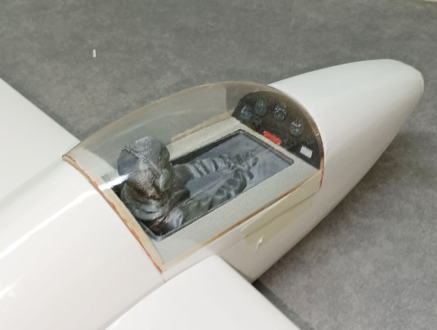 La cabine est préparée, mais il reste à ajuster la verrière, peindre tout le baquet et le pilote, coller la verrière et peindre le pourtour...